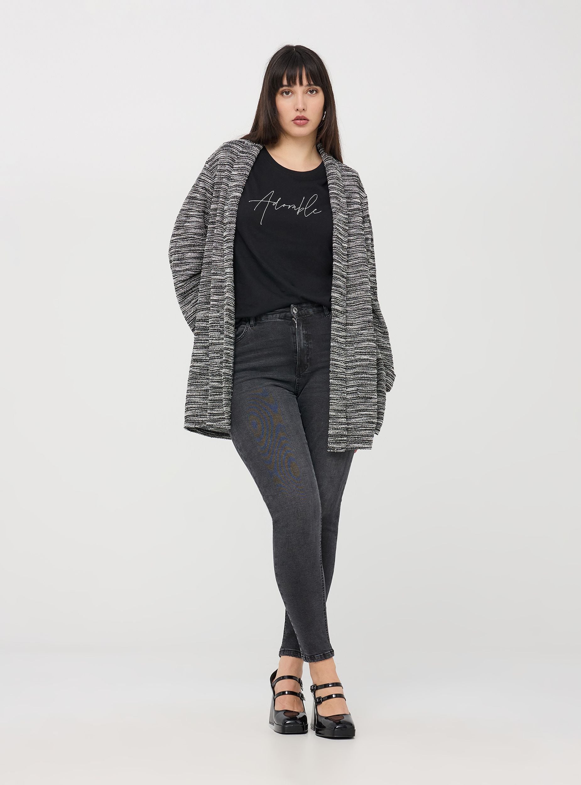 Ženska jakna od bouclé tkanine, otvorena napred bez zatvaranja. Dizajn sadrži strukturiranu tkaninu sa melange efektom. Rukavi su dugi i ima velike prednje džepove i rever. Idealna za ležeran, ali elegantan izgled, savršena za jesen i zimu.Detalji