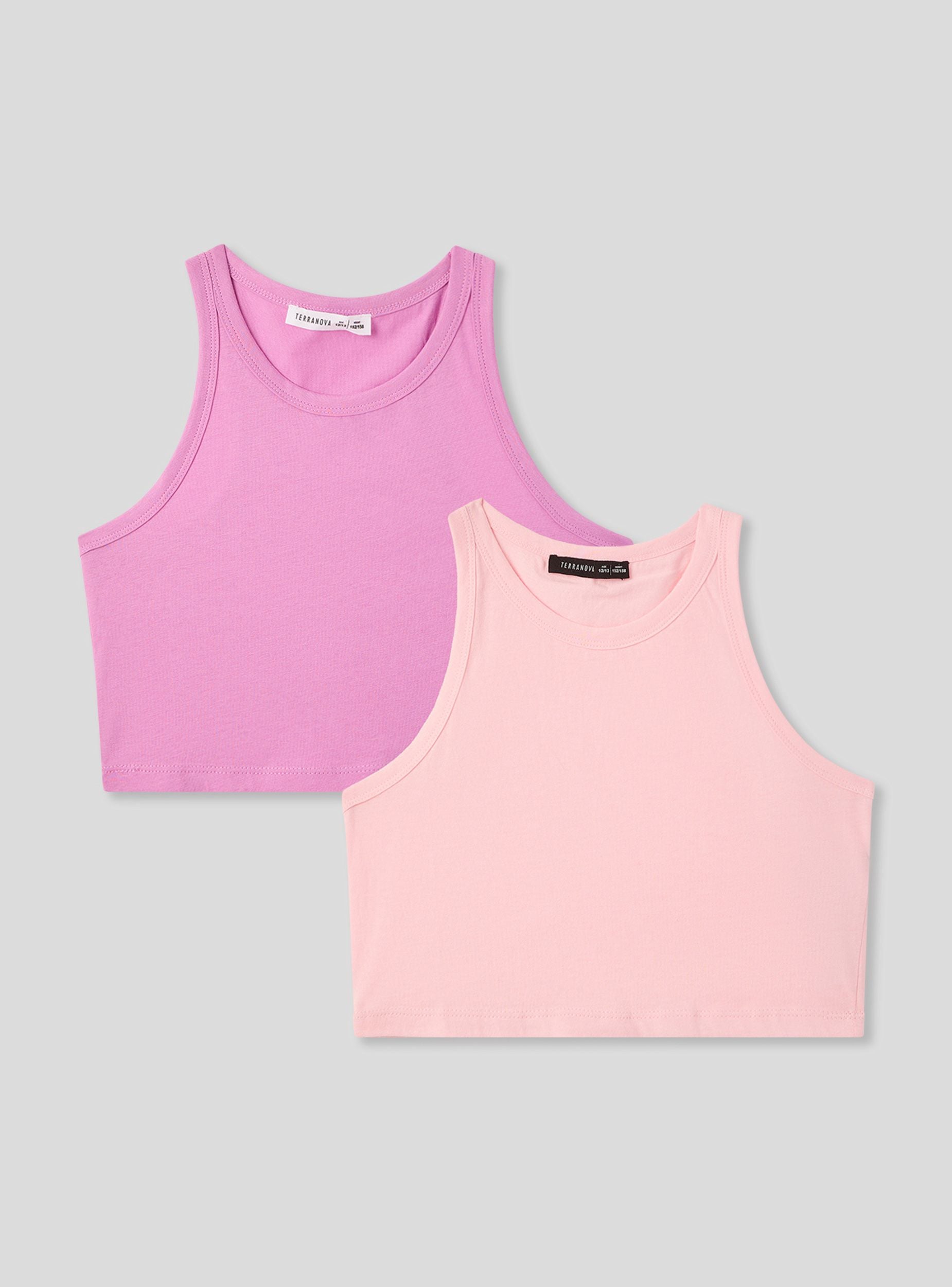 Confezione composta da 2 top da bambina dal design moderno e versatile. Entrambi presentano una raffinata tinta unita e uno scollo americano che dona un tocco sportivo e contemporaneo. Il taglio crop li rende ideali per creare outfit estivi comodi e alla moda, perfetti per abbinamenti freschi e dinamici. Pensati per accompagnare le giornate all’insegna dello stile e del divertimento.Detalji
