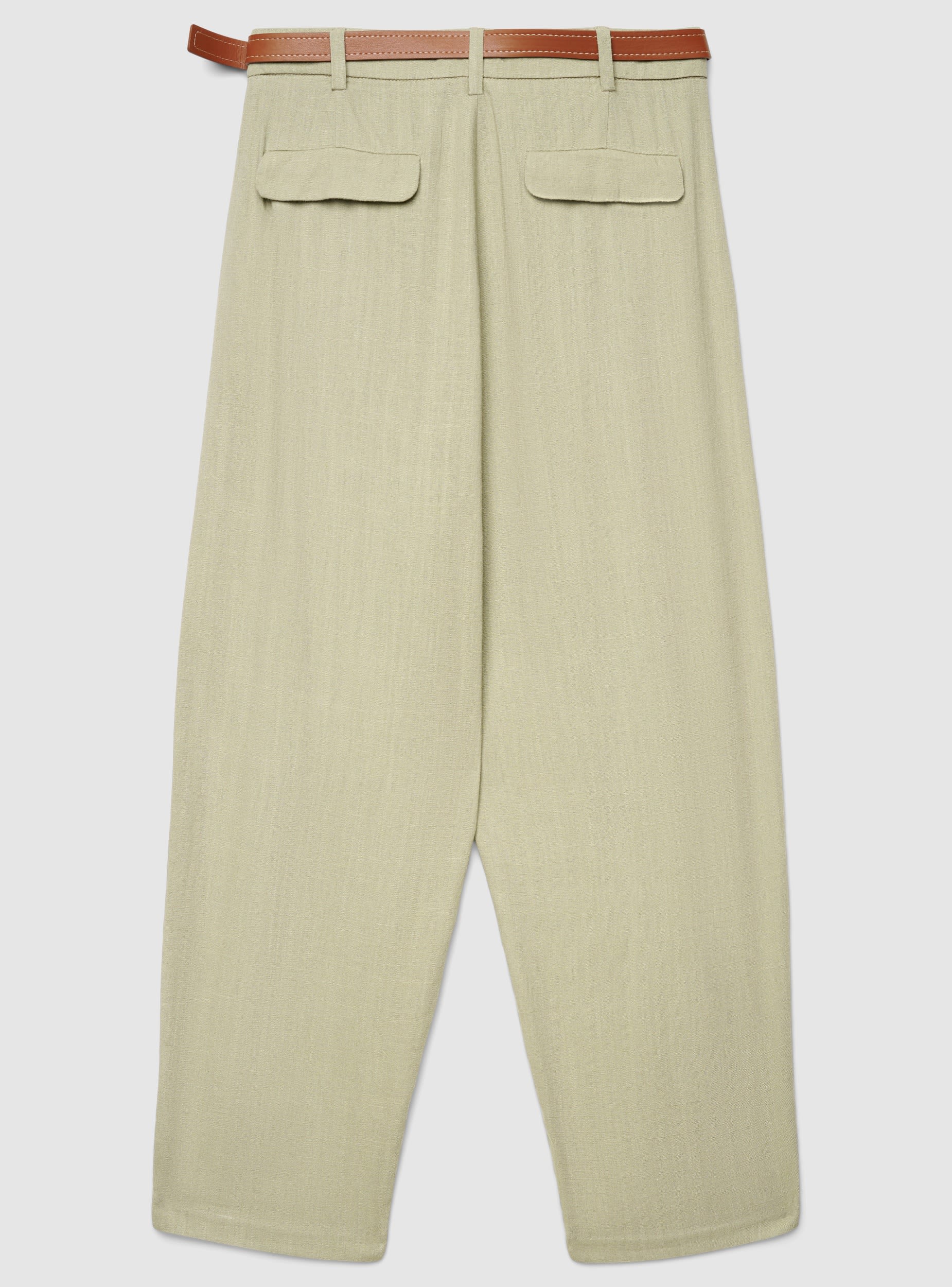 Ženske pantalone dugih nogavica u jednobojnoj varijanti, sa chinos stilom i svestrane za dnevne ili kancelarijske kombinacije. Pojas u struku definiše siluetu, dok prednje plisirane nabore dodaju volumen i udobnost. Zatvaranje na rajsferšlus i dugme, petlje za kaiš i bočni džepovi sa ušivenim ivicama. Idealne u kombinaciji sa košuljama, topovima ili blejzerima za pažljivo osmišljene outfite.Detalji