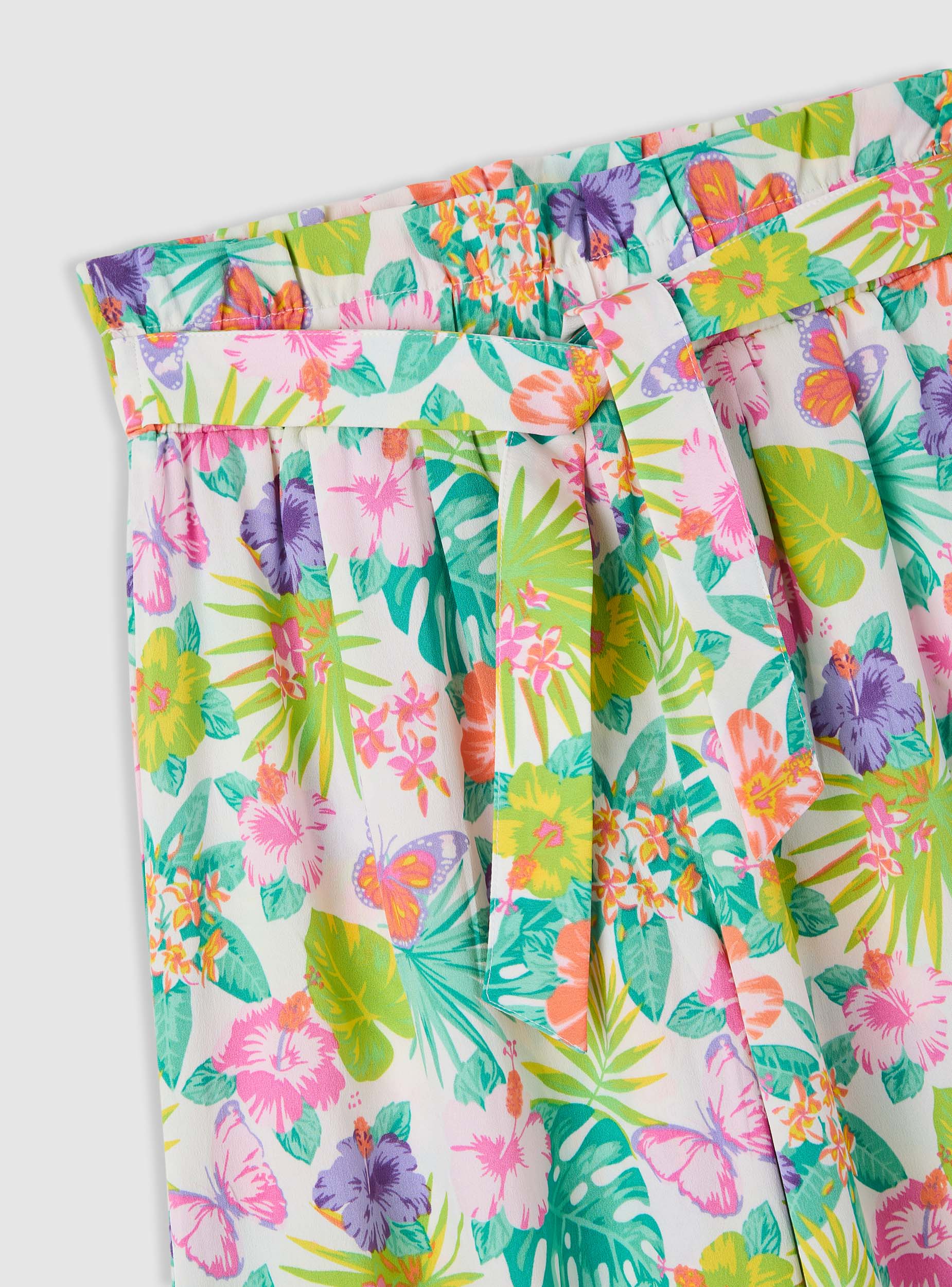 Široke pantalone za devojčice sa printom cveća i listova, dizajnirane za živahne letnje kombinacije. Visoki struk je istaknut koordinaranim kaišem za vezivanje, idealnim za podešavanje pristajanja i stvaranje urednog stajlinga. Dugačka dužina i mekani kroj prate pokrete, savršene uz topove, majice i sandale za školu, odmor i slobodno vreme.Detalji