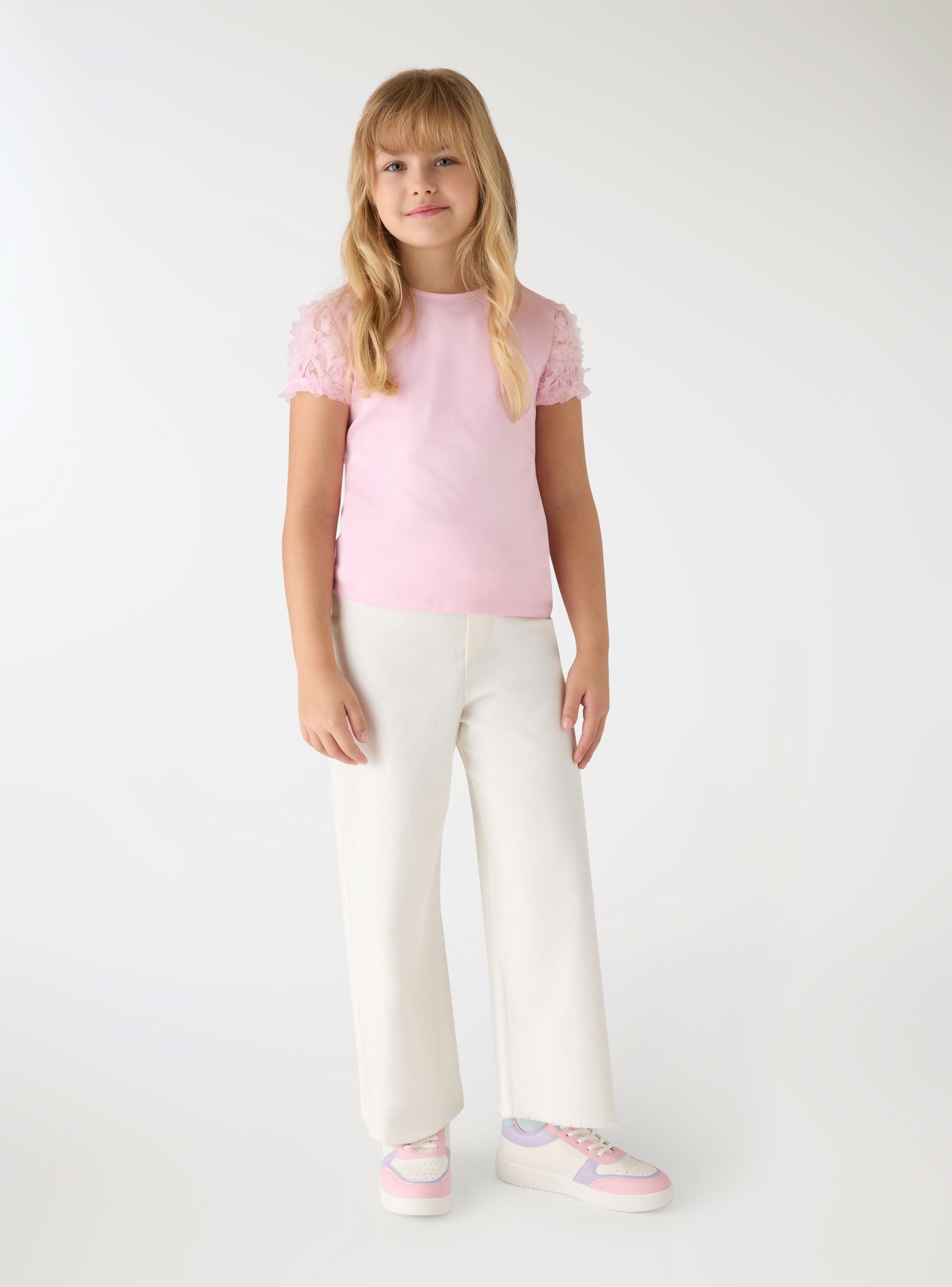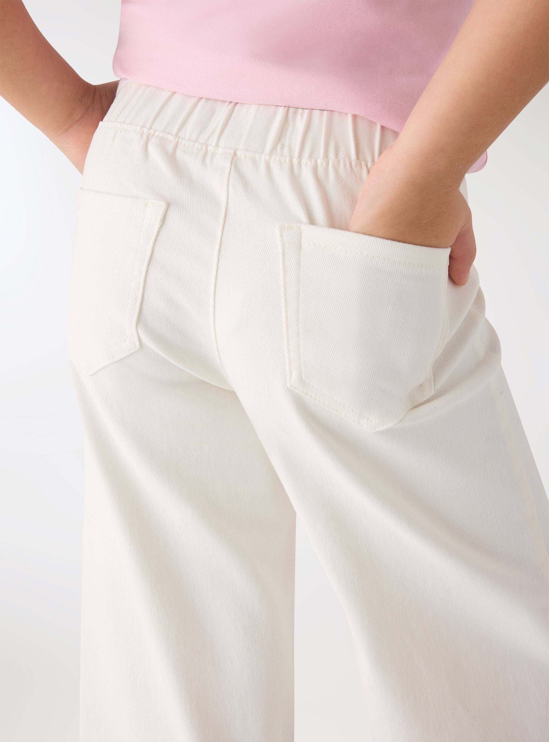 Dečije pantalone za devojčice u jednobojnoj varijanti sa širokim nogavicama. Elastičan struk za svakodnevnu udobnost. Neobrađeni rub koji daje moderan izgled. Idealne za školu i slobodno vreme, mogu se kombinovati sa majicom i patikama ili laganom duksericom. Udoban kroj i široka, ravna silueta, savršene za ležerne i moderne odevne kombinacije.Detalji