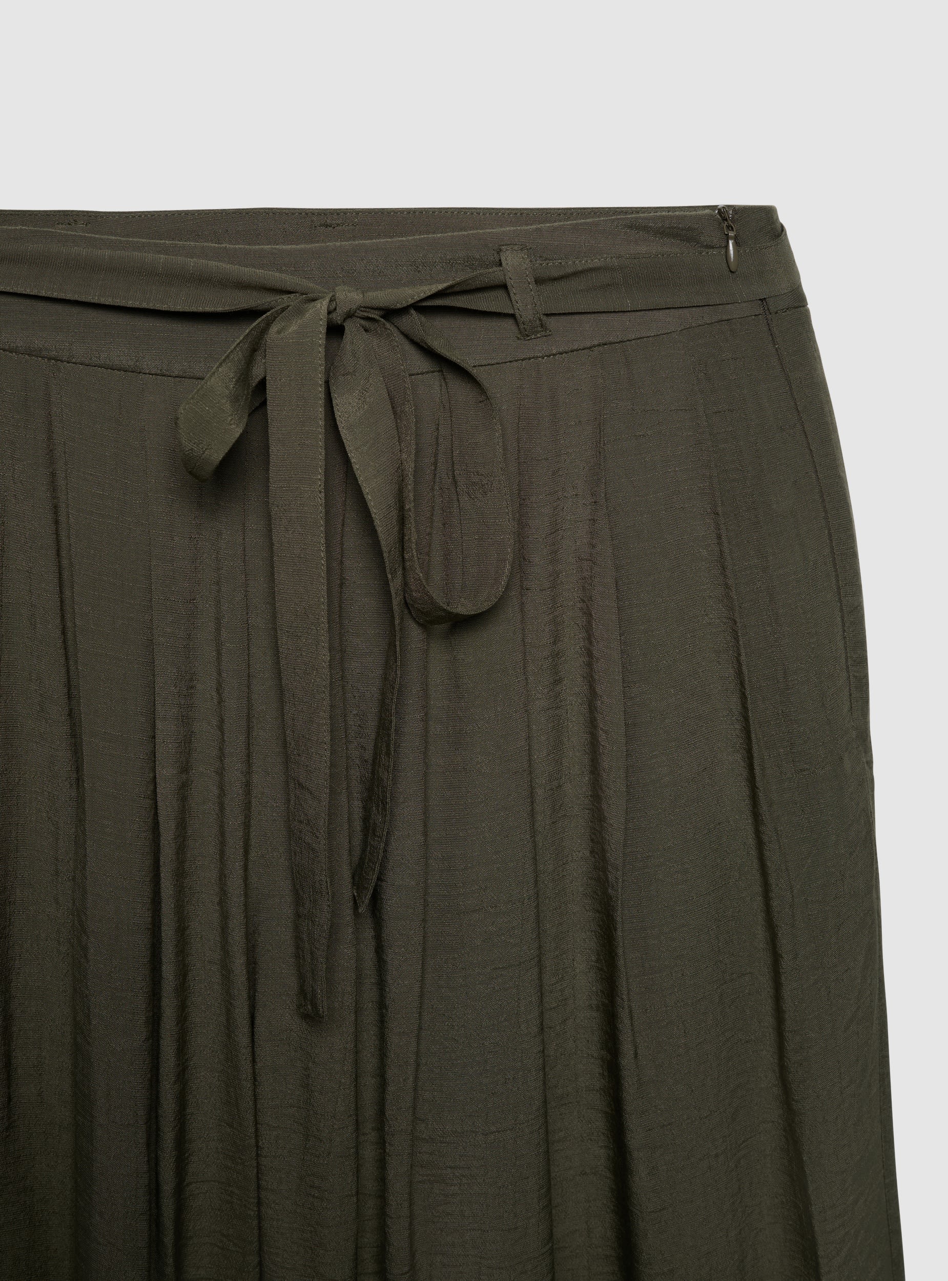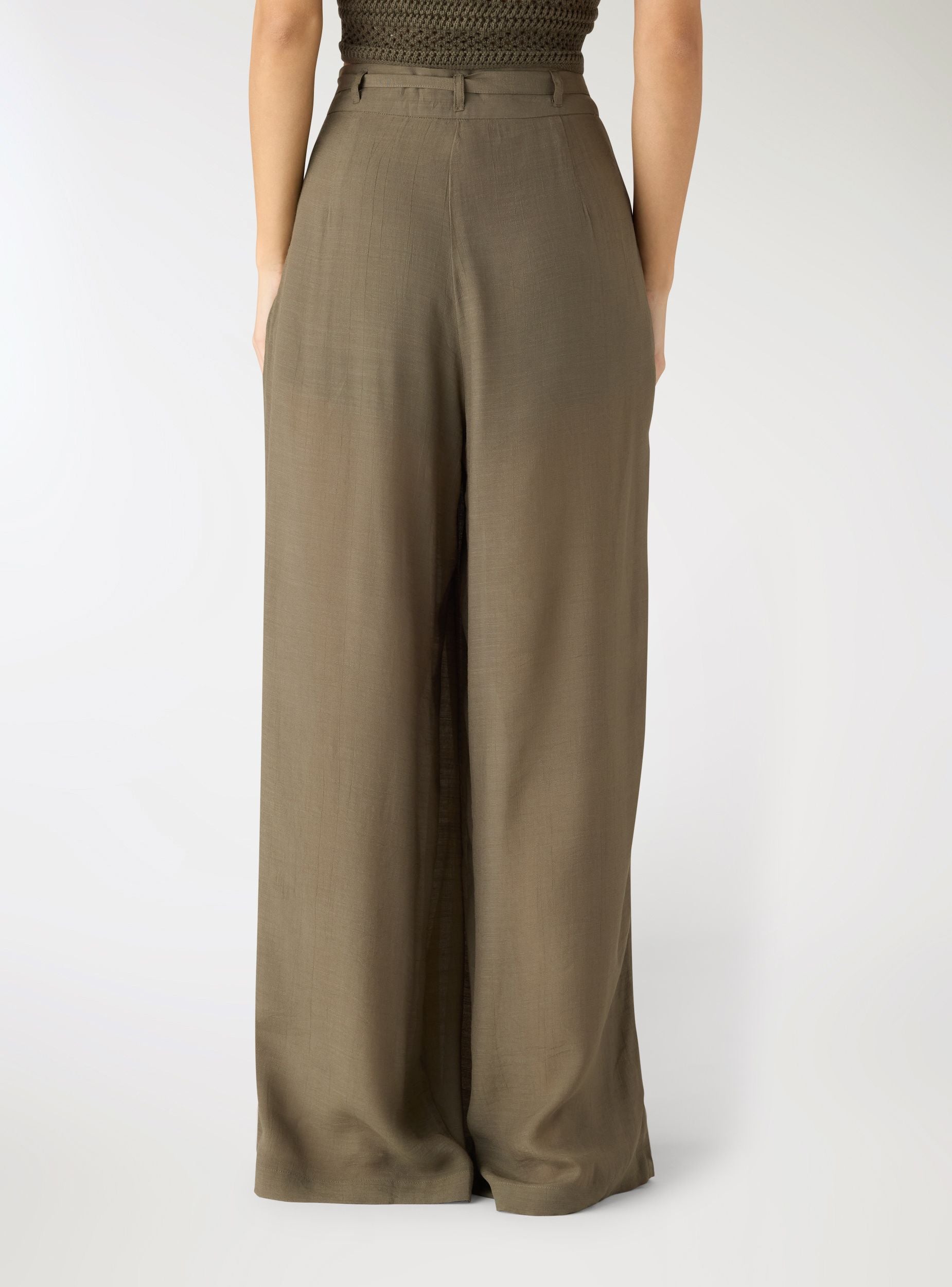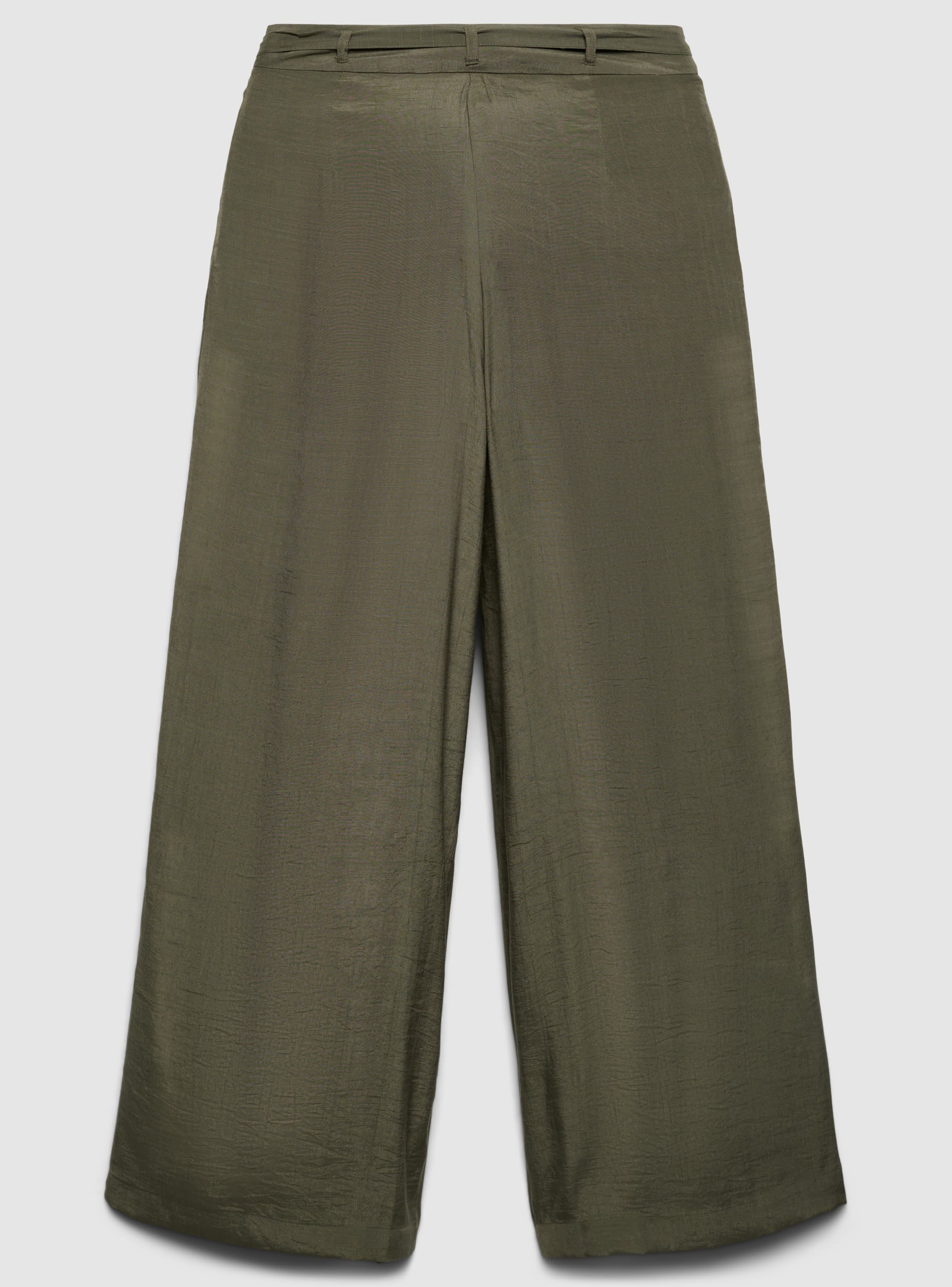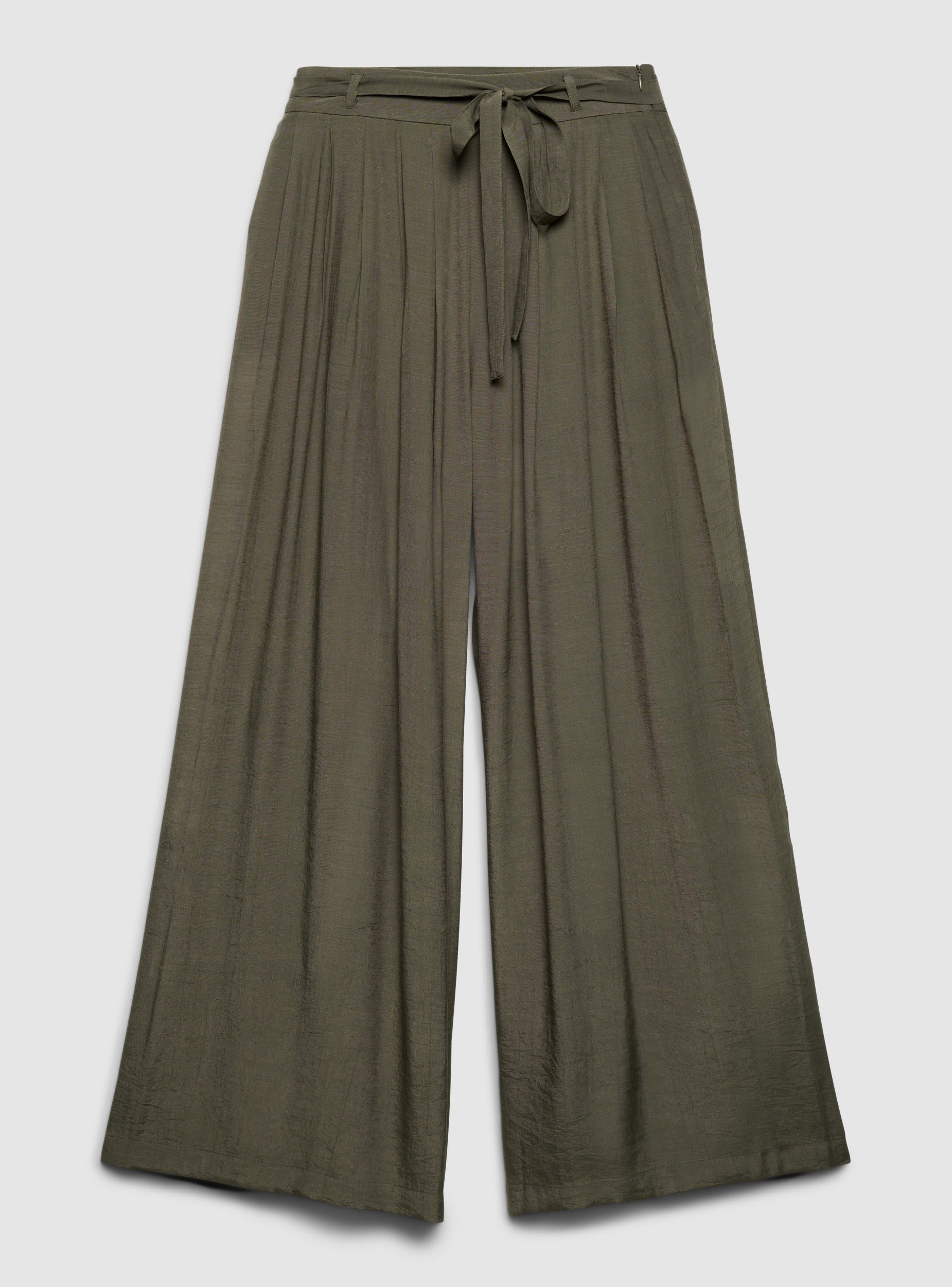 Ženske duge pantalone u jednobojnoj varijanti, širokog kroja (wide leg), namenjene urbanim i poslovnim kombinacijama. Struk je visok sa prorezima za kaiš i kaišem za vezivanje, dok prednje nabore daju pokret širokoj nozi. Zatvaraju se bočnim rajsferšlusom. Preporučuju se u kombinaciji sa uskim topovima ili laganim košuljama, uz sandale ili patike.Detalji