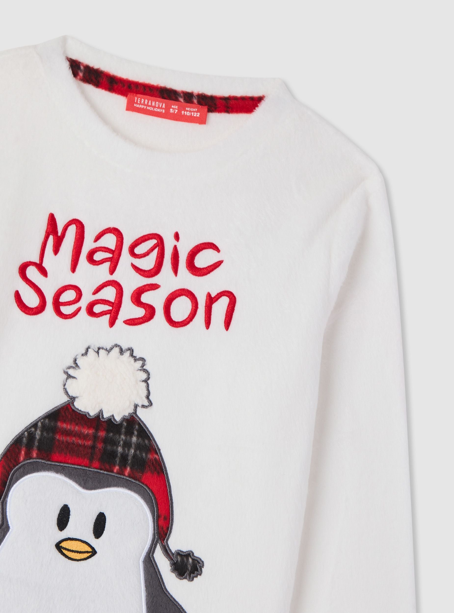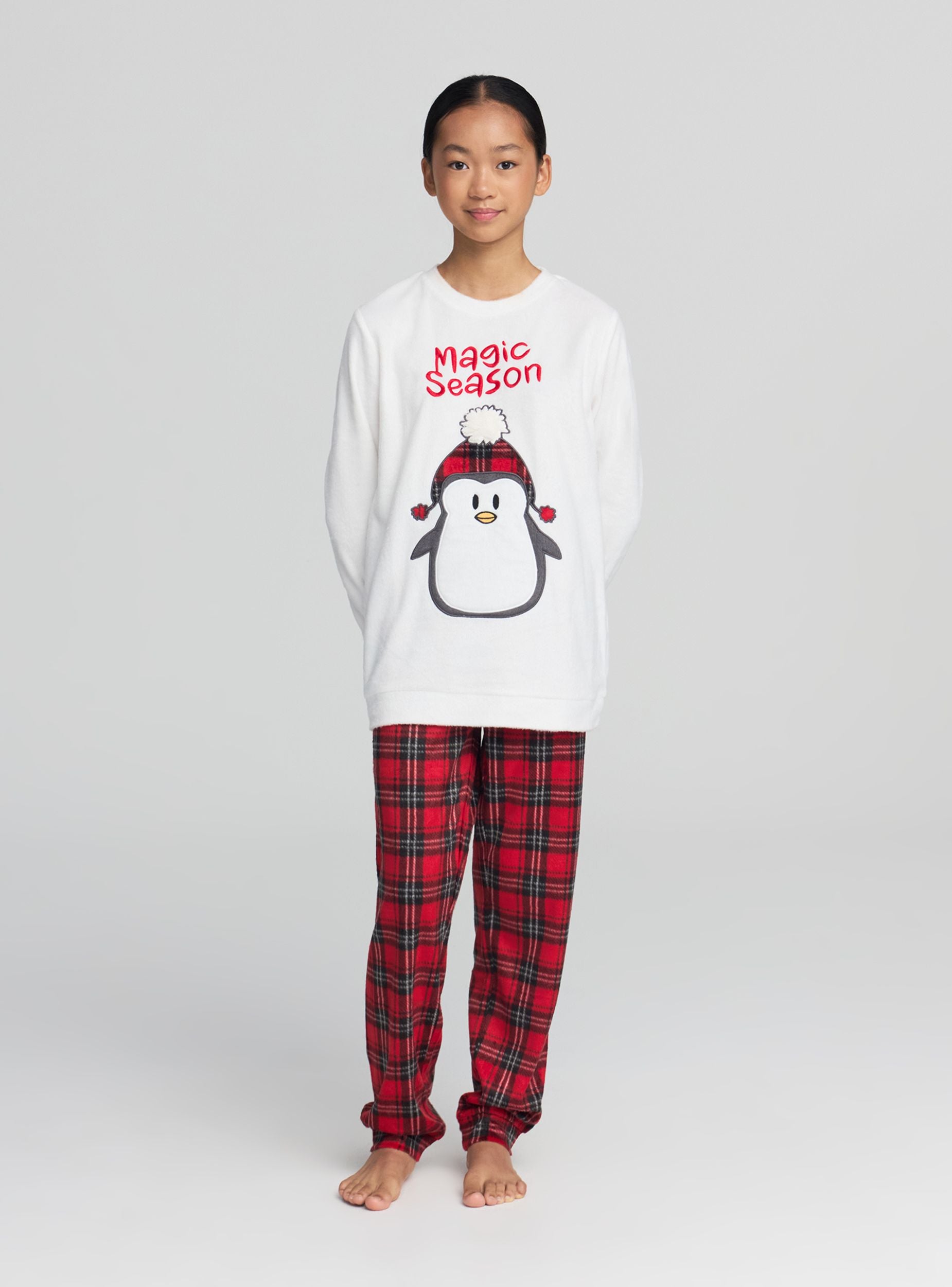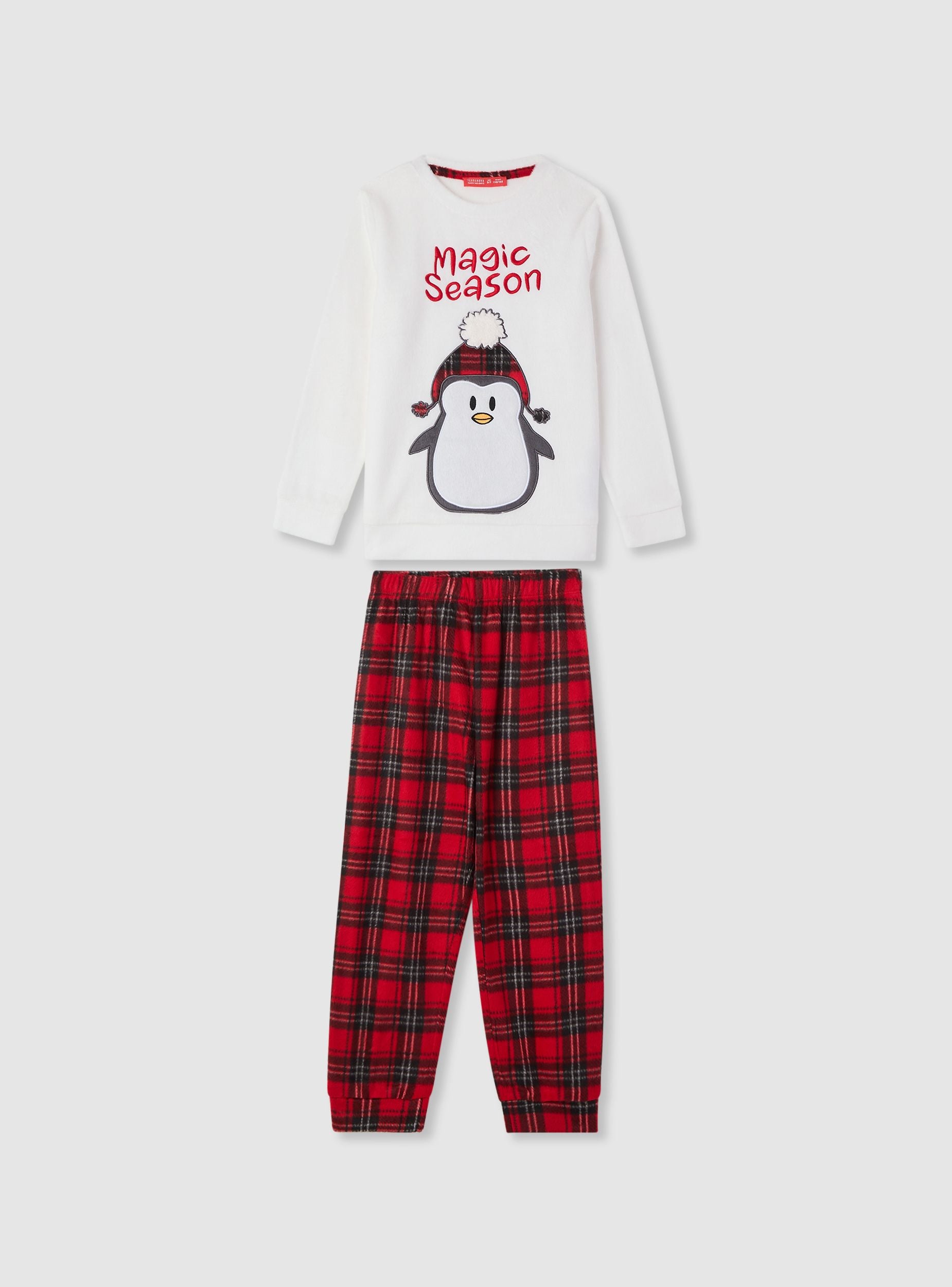 Dvodelni dečiji pidžama sa majicom dugih rukava i dugim pantalonama. Majica sa okruglim izrezom, natpisom „Magic Season“ i velikim aplikovanim pingvinom, savršena za zimske večeri. Pantalone sa kariranim dezenom, elastičnim pojasom i manžetnama na nogavicama za udobnost. Idealna za opuštanje kod kuće ili za odmor, lako se kombinuje sa čarapama protiv klizanja ili usklađenim ogrtačem.Detalji