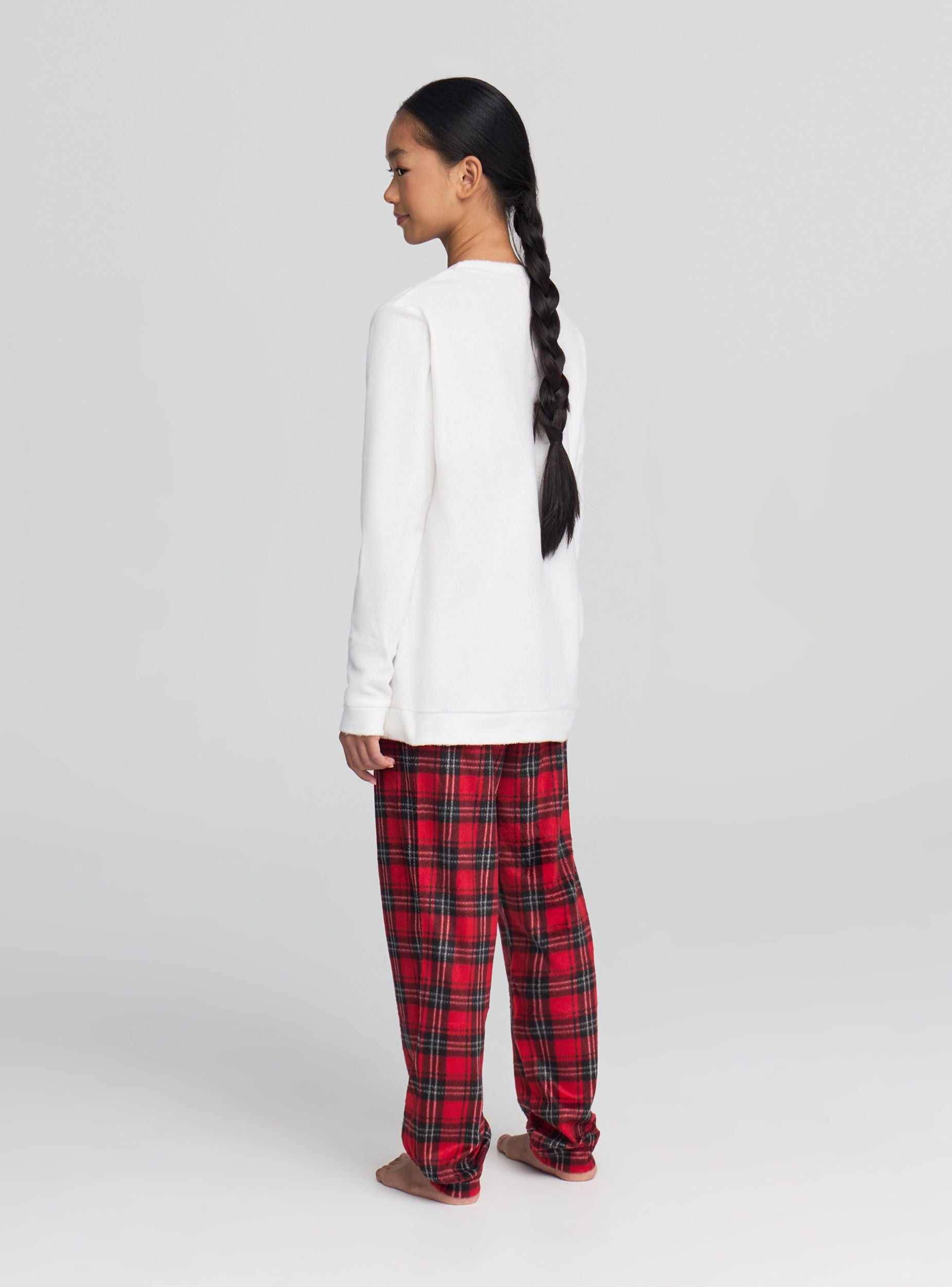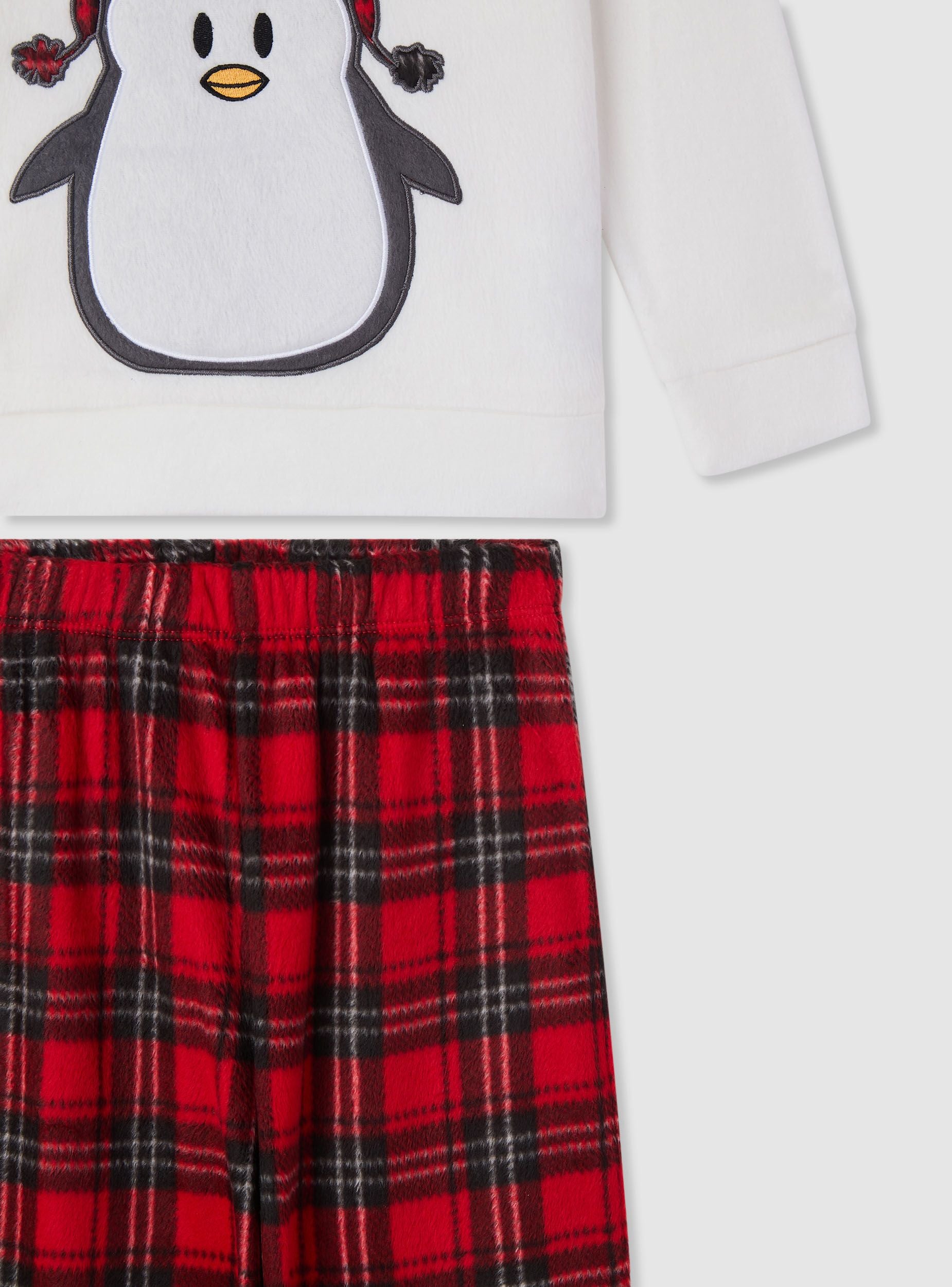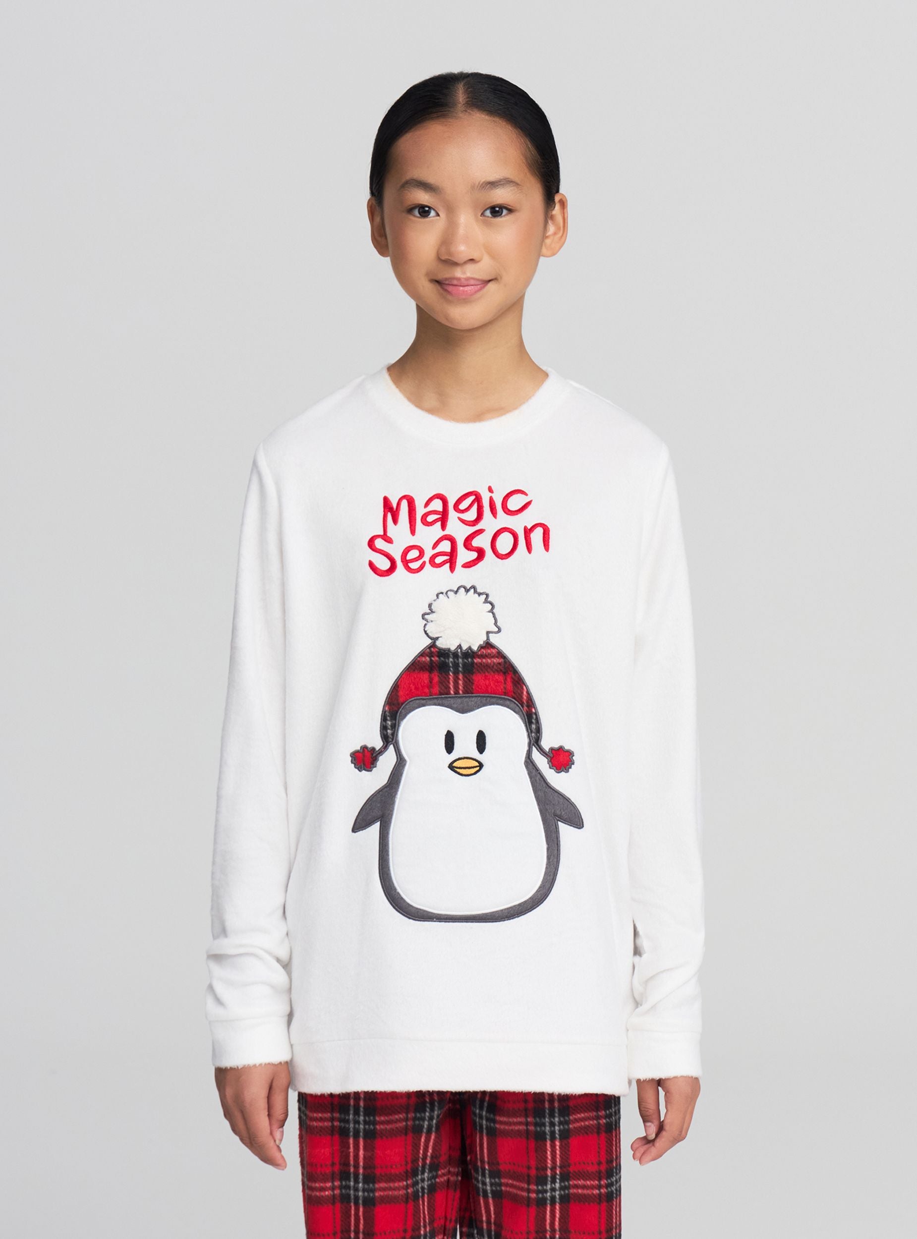 Dvodelni dečiji pidžama sa majicom dugih rukava i dugim pantalonama. Majica sa okruglim izrezom, natpisom „Magic Season“ i velikim aplikovanim pingvinom, savršena za zimske večeri. Pantalone sa kariranim dezenom, elastičnim pojasom i manžetnama na nogavicama za udobnost. Idealna za opuštanje kod kuće ili za odmor, lako se kombinuje sa čarapama protiv klizanja ili usklađenim ogrtačem.Detalji