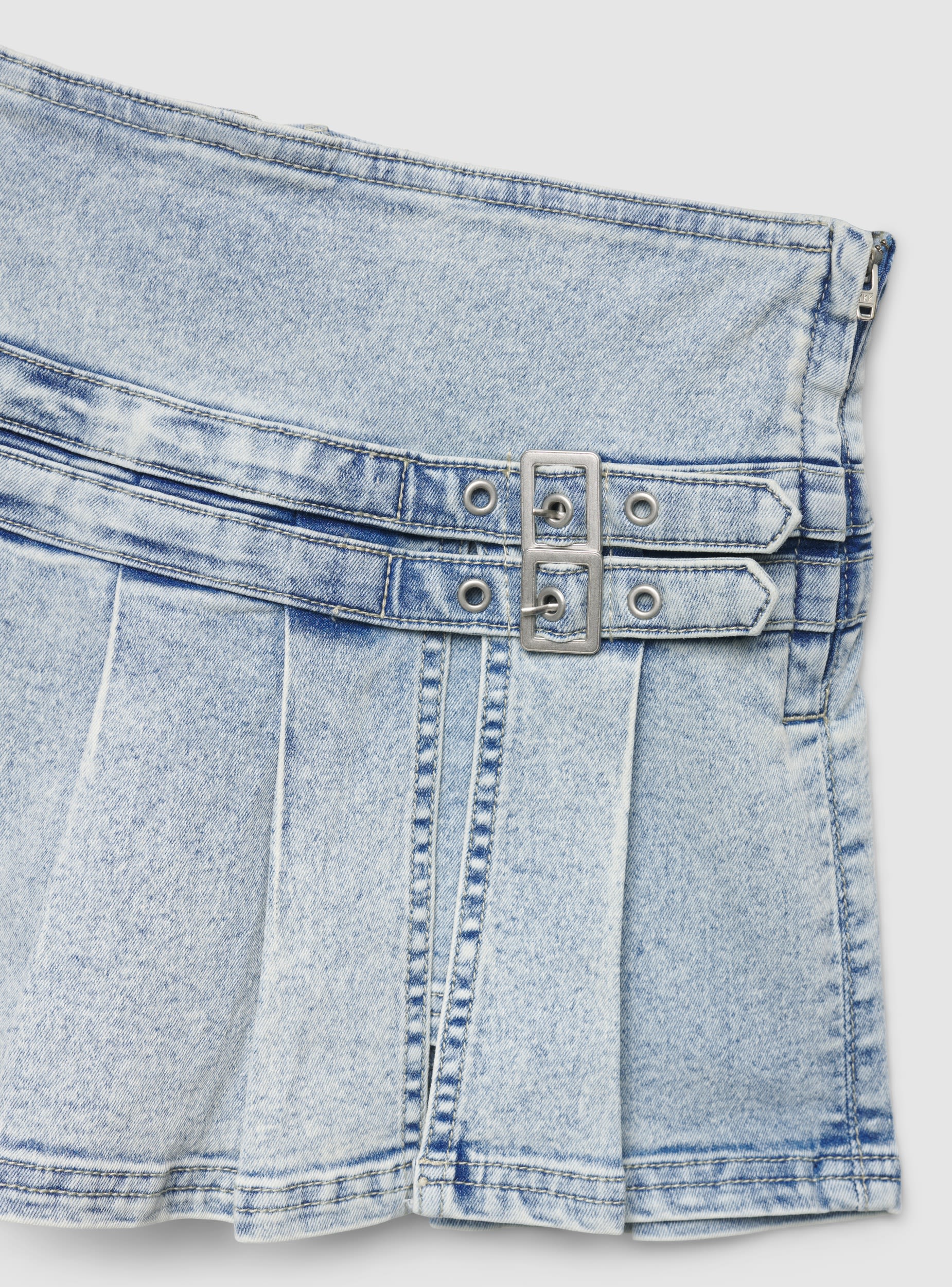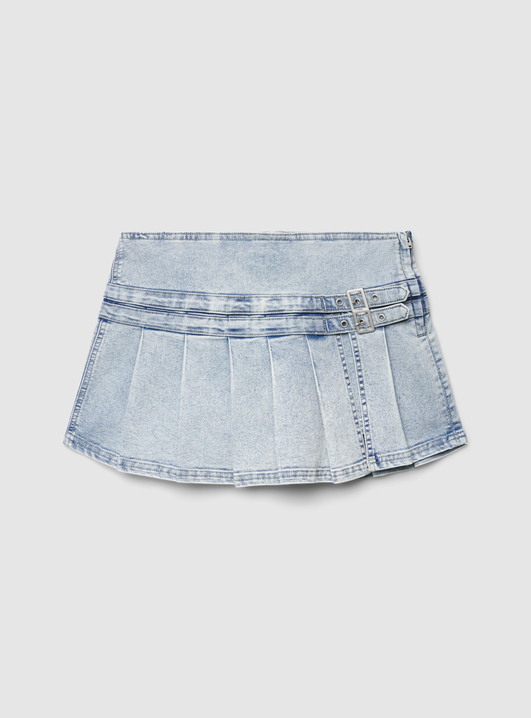 Ženska suknja u jednobojnoj varijanti sa izraženim naborima i kaiševima sa dvostrukom kopčom sa strane. Mini dužina idealna za urbane i trendi kombinacije, lako se slaže sa majicom i patikama ili sa košuljom i čizmama. Bočno zatvaranje na rajsferšlus za praktično nošenje. Struktuirani dizajn koji ističe siluetu, savršen za večernje izlaske ili vikend. Odvažan stil sa istaknutim metalnim detaljima.Detalji