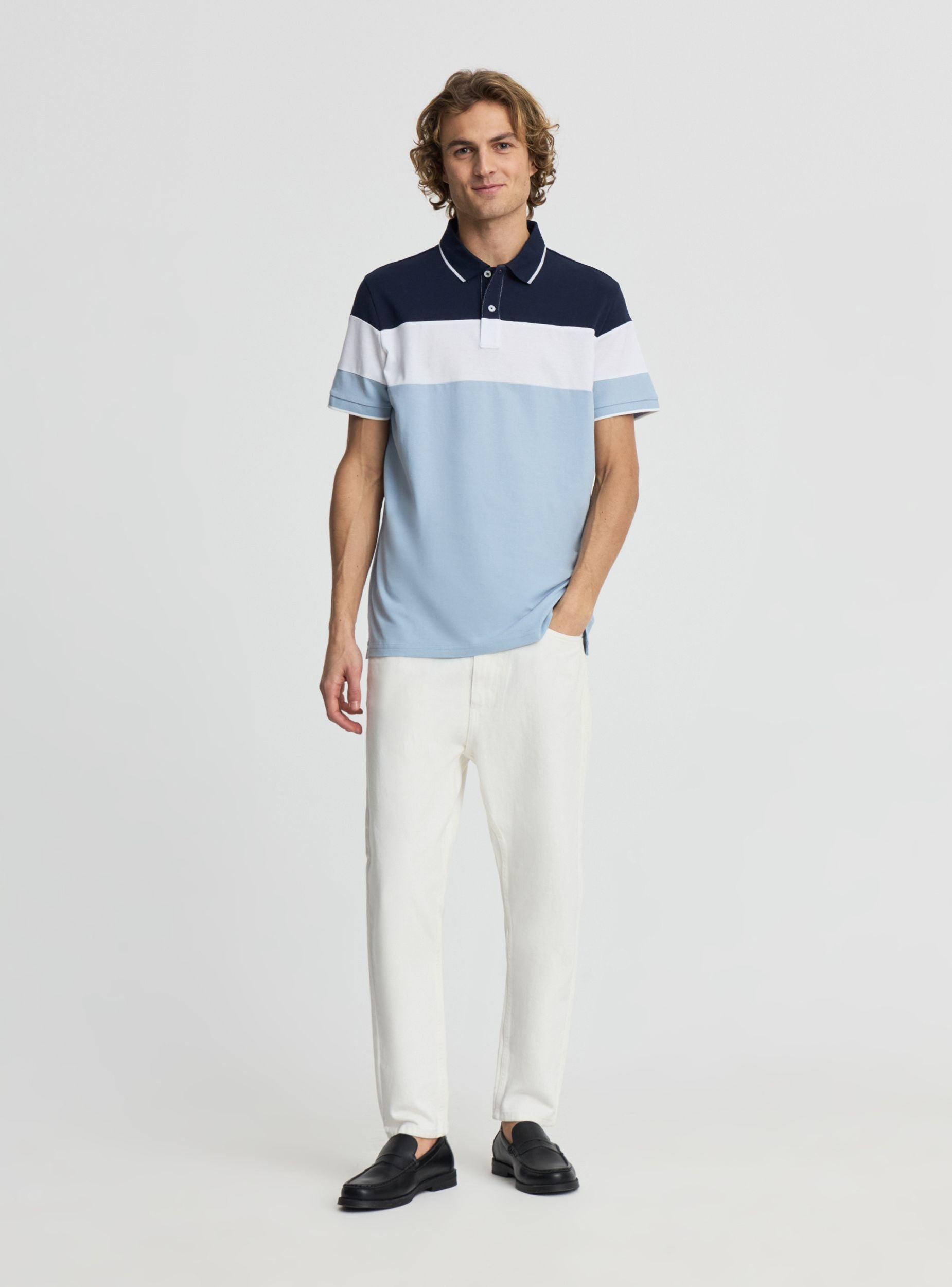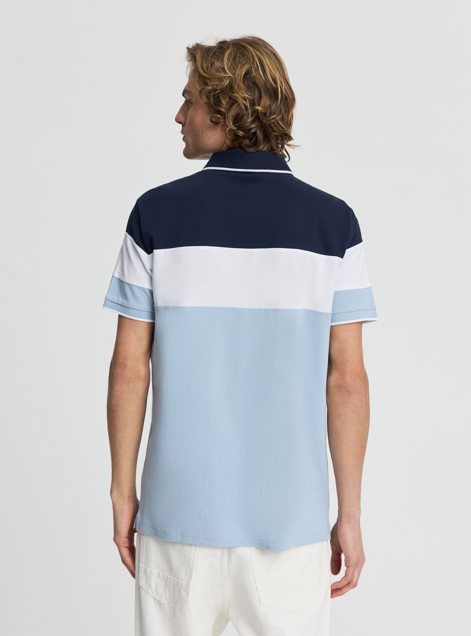 Muška polo majica sa dezenom u blokovima boja, savršena za ležeran i urbani izgled. Polo kragna, prednje otvaranje sa dugmadima i kratki rukavi. Regular kroj, idealna uz farmerke ili chino pantalone za slobodno vreme. Dizajn sa horizontalnim kontrastnim prugama koje daju karakter tvom outfitu. Lako se nosi ispod lagane jakne ili sa patikama.Detalji