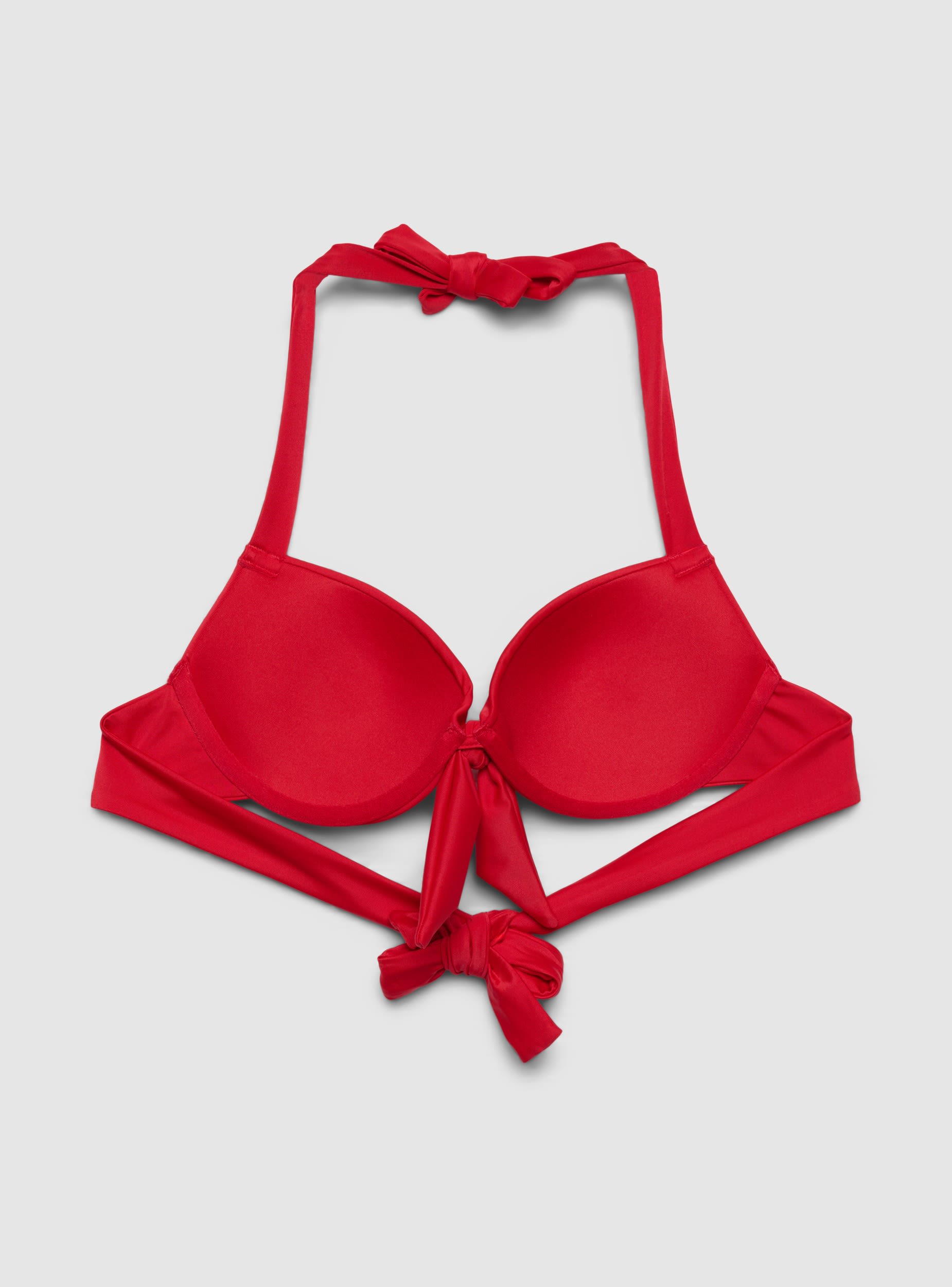 Bikini gornji deo za žene u jednobojnoj varijanti sa podstavljenim korpicama i push-up efektom za istaknuto podupiranje. Centralna mašnica dodaje ženstveni detalj, dok naramenice sa natpisom pružaju moderan dodir. Model sa trakicama za vezivanje radi podešavanja veličine, idealan za dane na moru i bazenu, u kombinaciji sa usklađenim donjim delom.Detalji