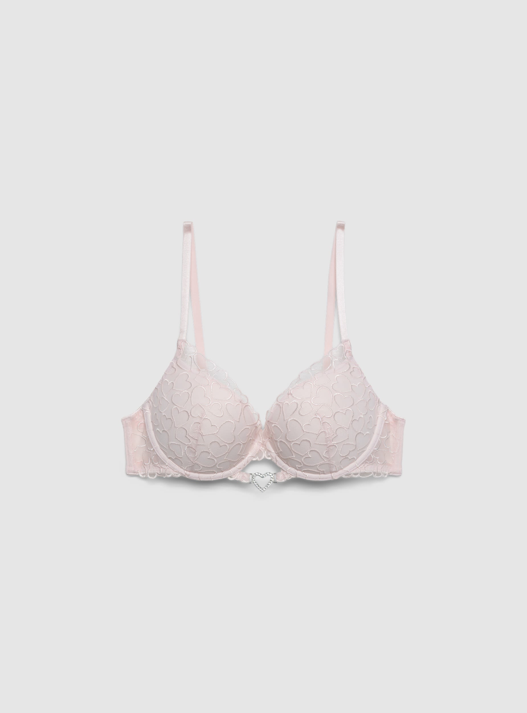 Ženski push-up grudnjak sa podstavljenim korpicama i žicom, dezen sa izvezenim srcima i detaljem u obliku srca sa cirkonom u sredini. Podesive naramenice i zatvaranje pozadi sa kukicama, ivice sa nežnim čipkanim umecima. Savršen ispod duboko izrezanih topova ili košulja, ističe dekolte pružajući podršku i udobno prianjanje.Detalji