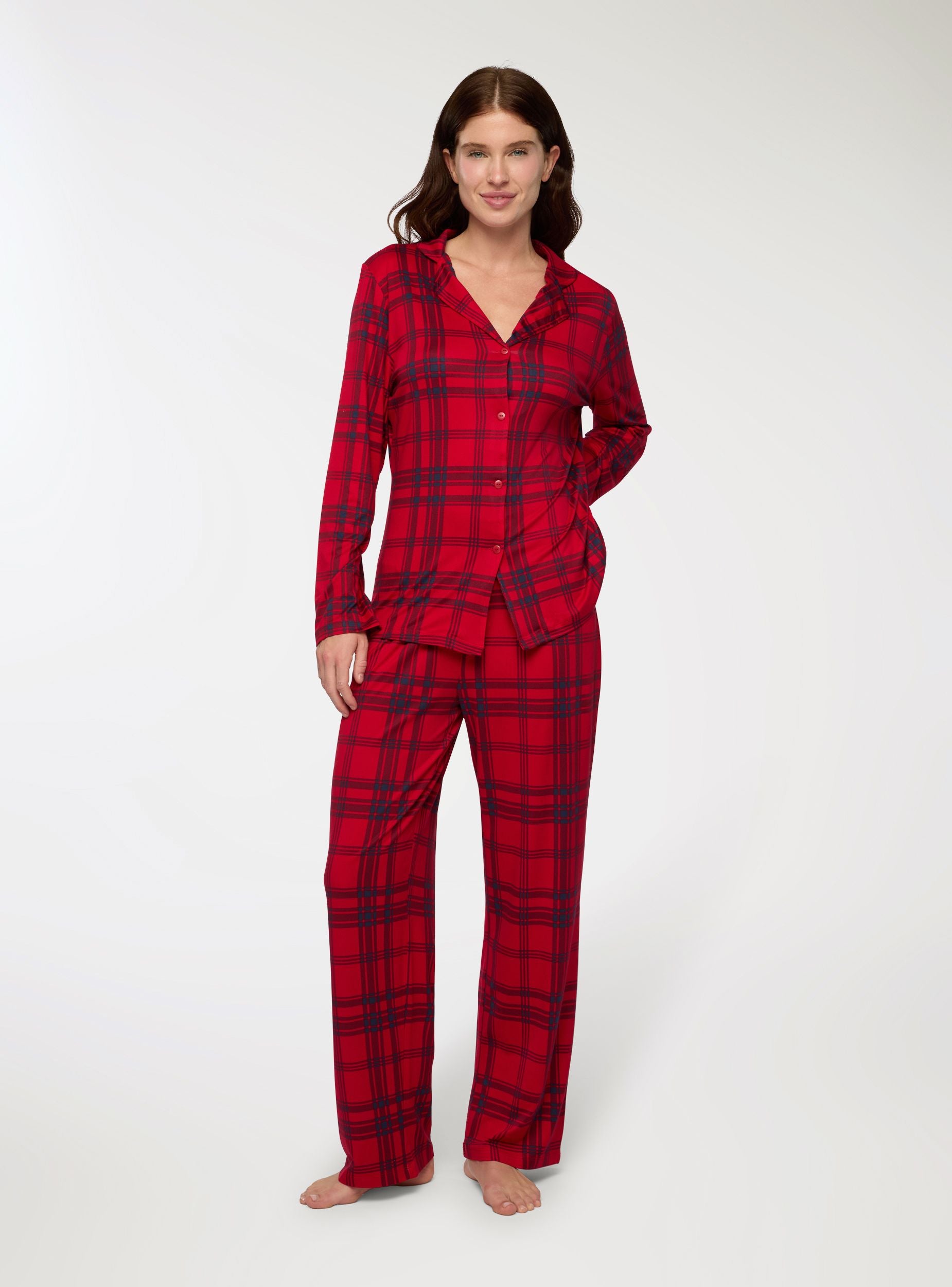 Ženski pidžama komplet koji se sastoji od košulje sa dugim rukavima i dugih pantalona. Košulja ima okovratnik sa reverima i kopča se na dugmad, dok pantalone imaju elastični pojas za maksimalnu udobnost. Dizajn sa karo dezenom dodaje stil, čineći ga idealnim za opuštanje kod kuće. Savršen je za one koji traže praktičnost i svestranost bez odricanja od elegancije.Detalji
