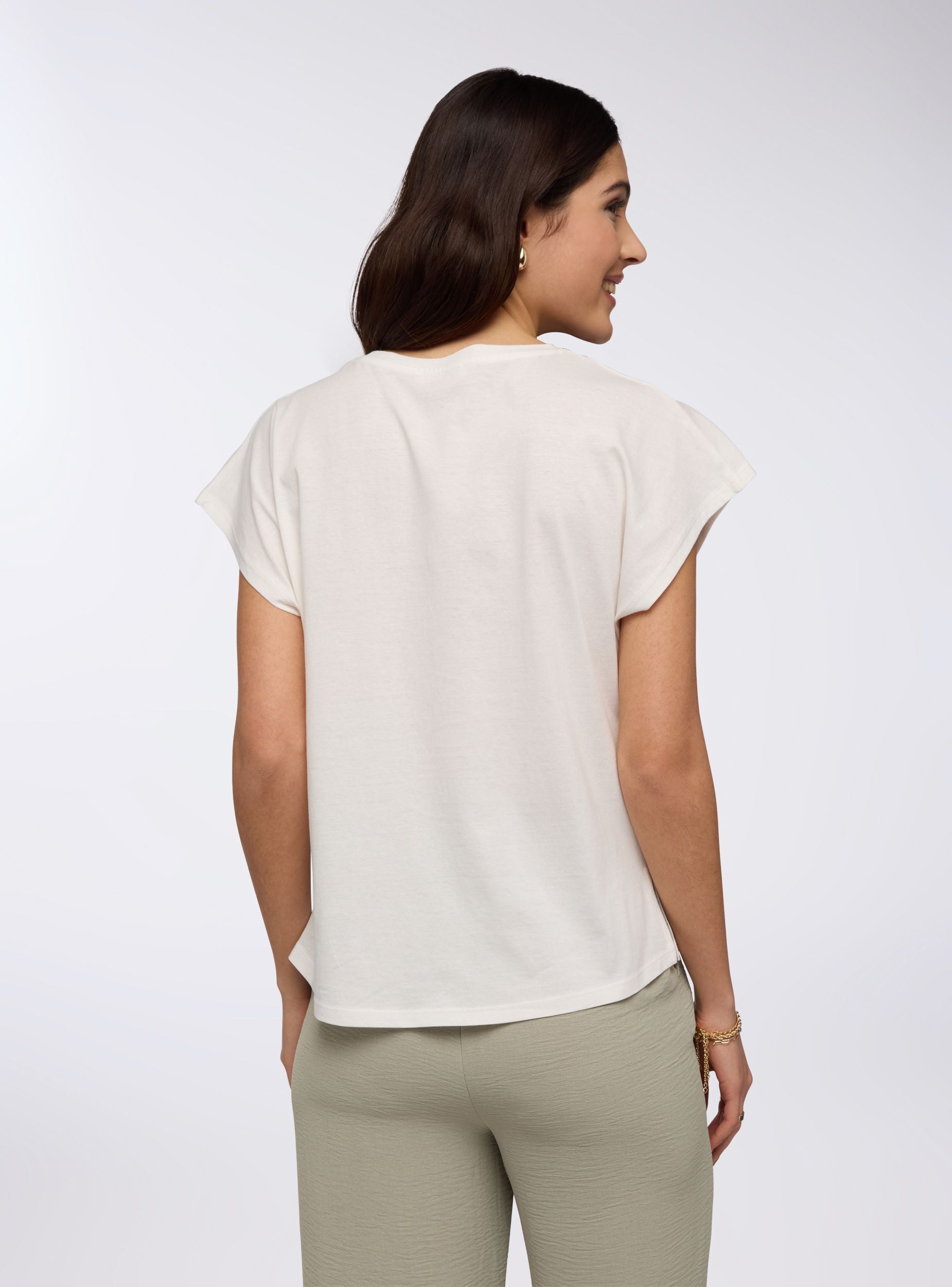 Široka ženska majica sa mekanim krojem, savršena za ležeran i ženstven izgled. Jednostavni dizajn obogaćen je cvetnim printom ukrašenim šljokicama, koje dodaju sjajan dodir. Kratki rukavi i okrugli izrez obezbeđuju udobnost i svestranost. Idealna je uz farmerke ili široke pantalone za opušteni outfit ili uz midi suknju za sofisticiraniji izgled.Detalji