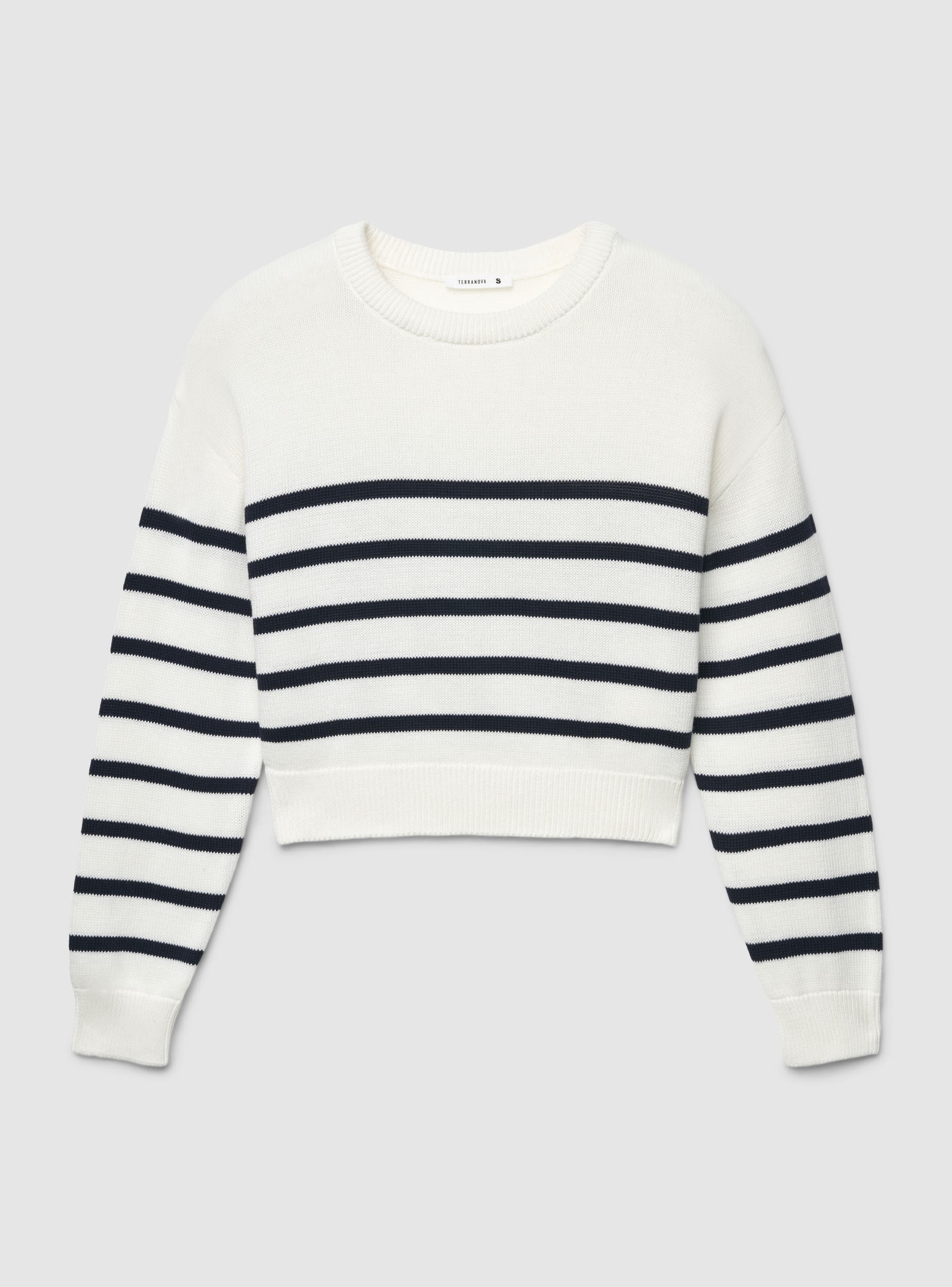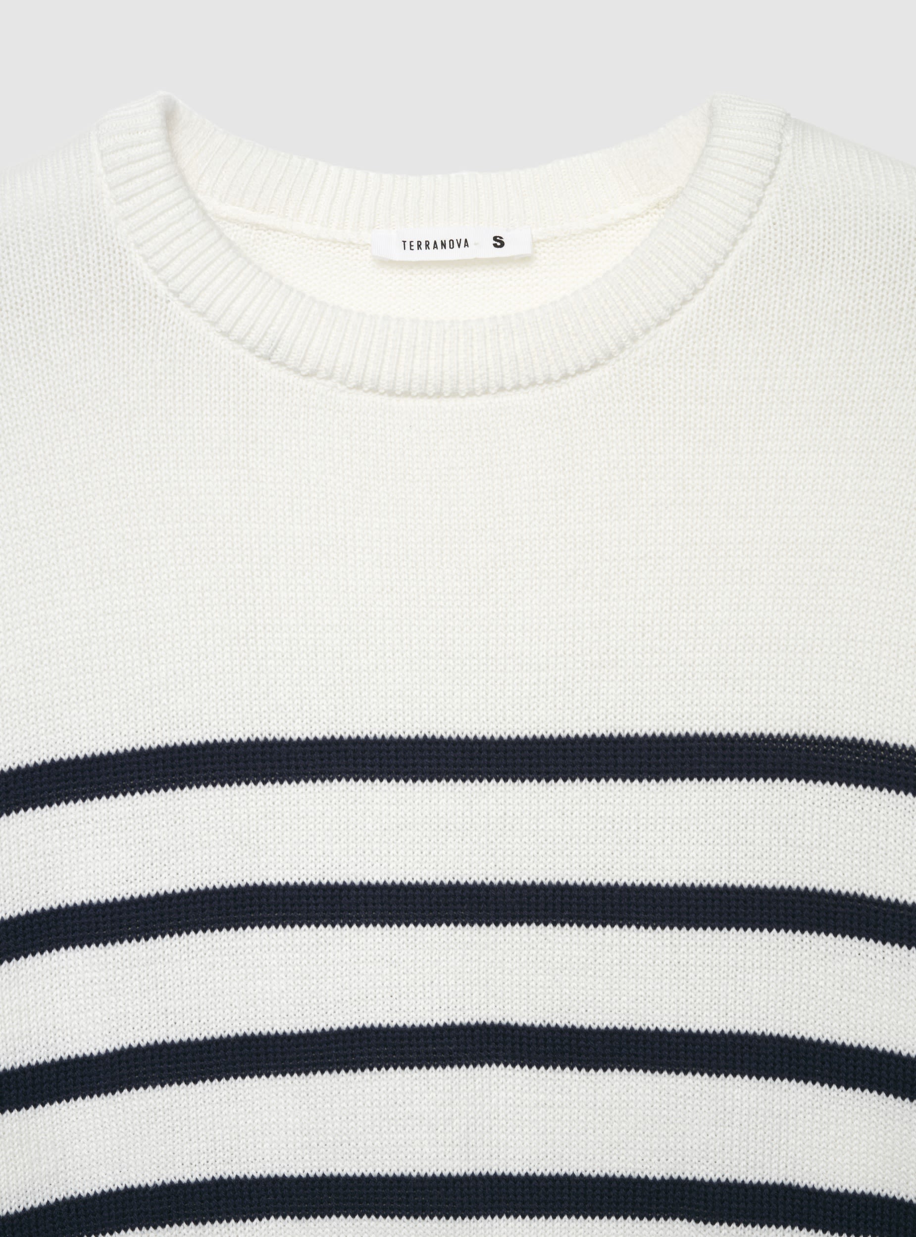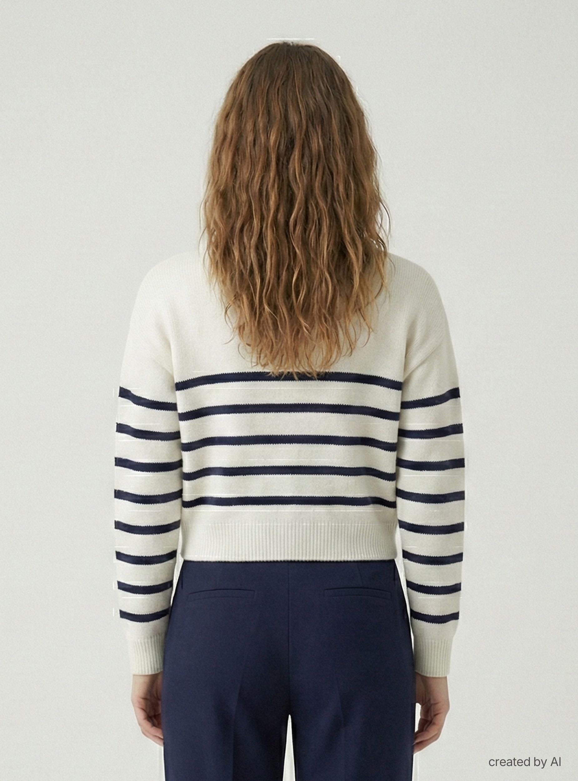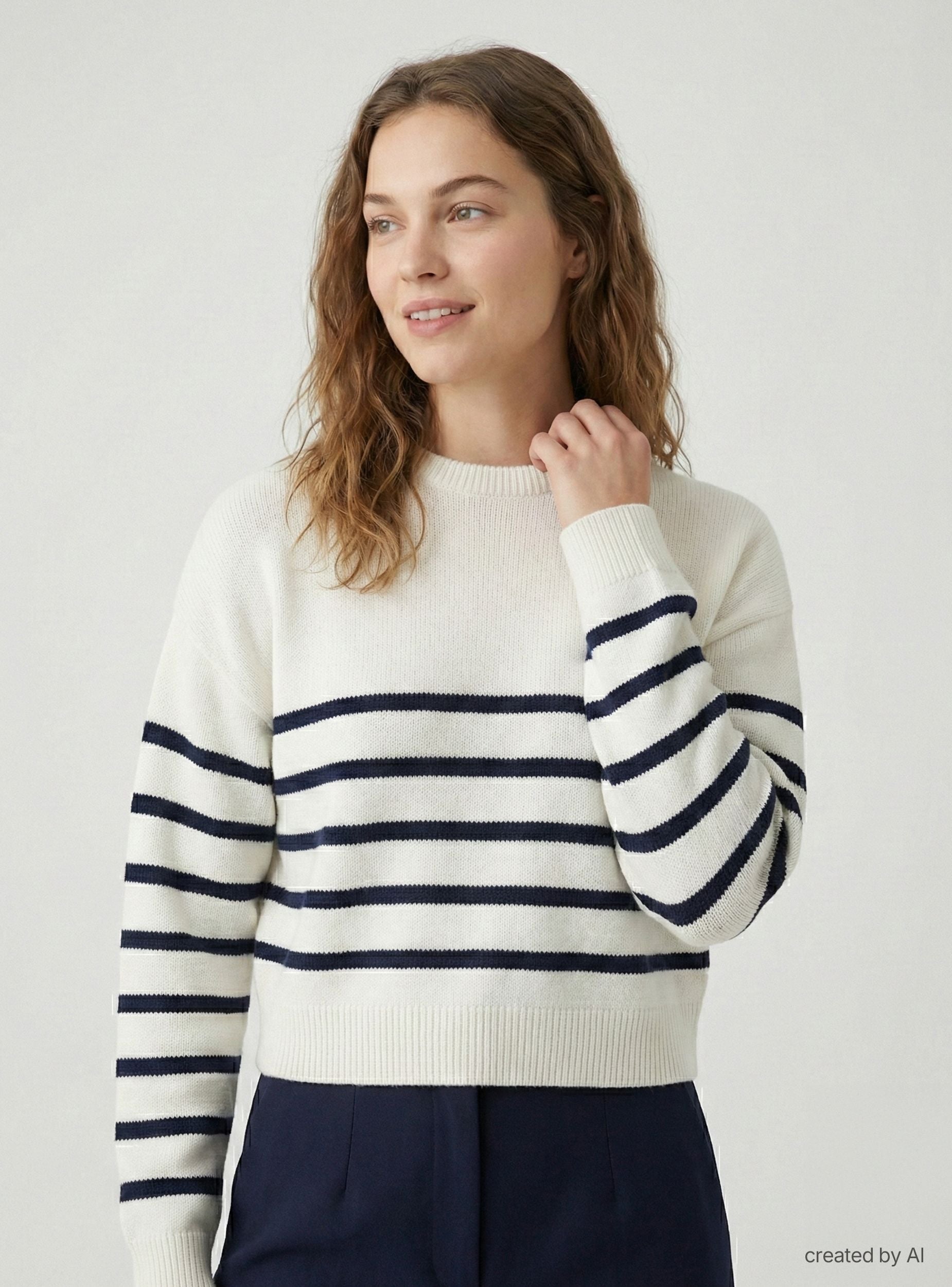 Ženska majica širokog kroja sa prugama, idealna za ležerne i slobodne prilike. Okrugli izrez i rebrasti manžeti definišu liniju, dok pleteni rad daje uredan izgled. Lako se kombinuje sa farmerkama, pantalonama sa visokim strukom ili suknjama, za svakodnevne i vikend kombinacije u gradu.Detalji