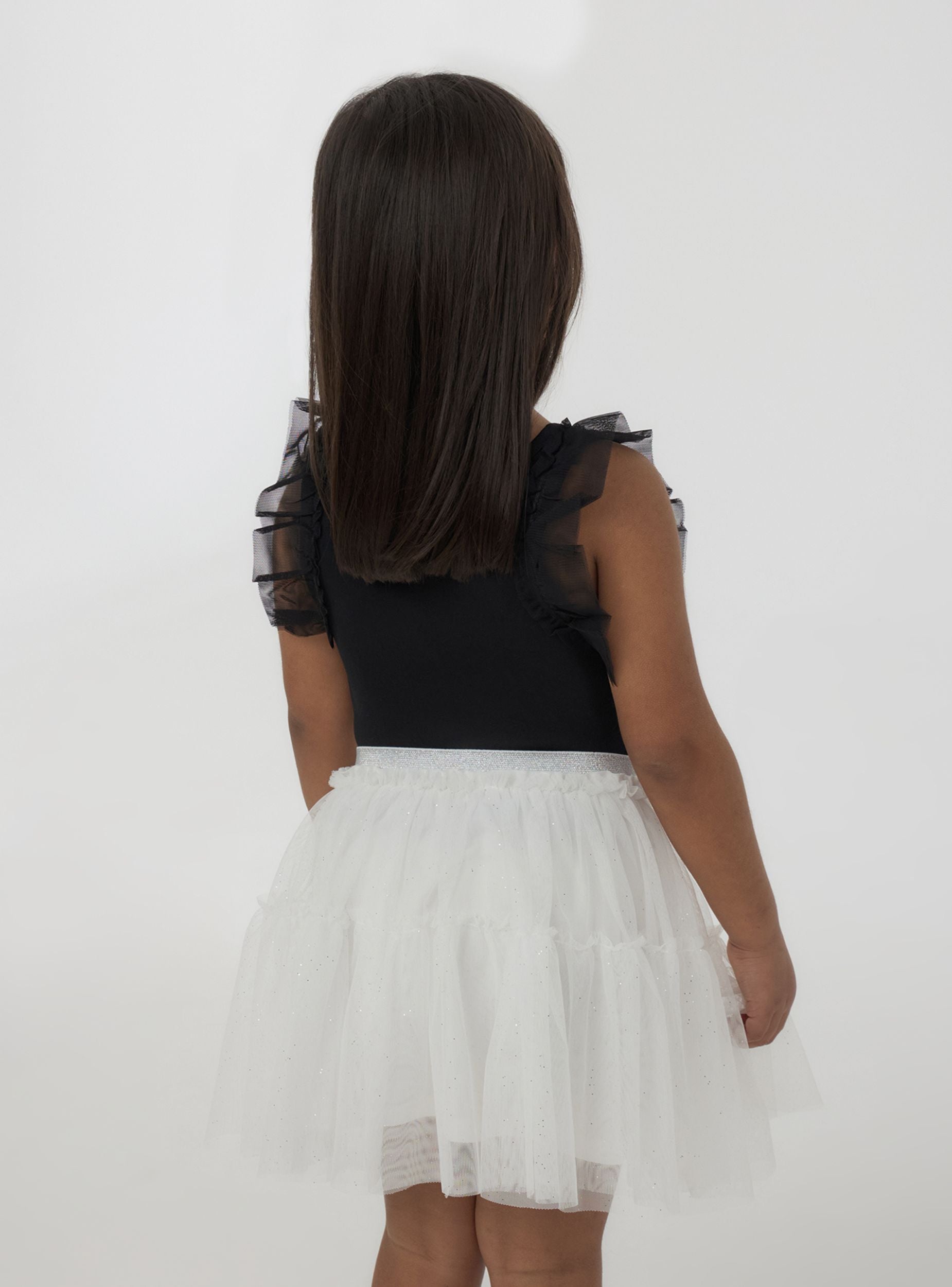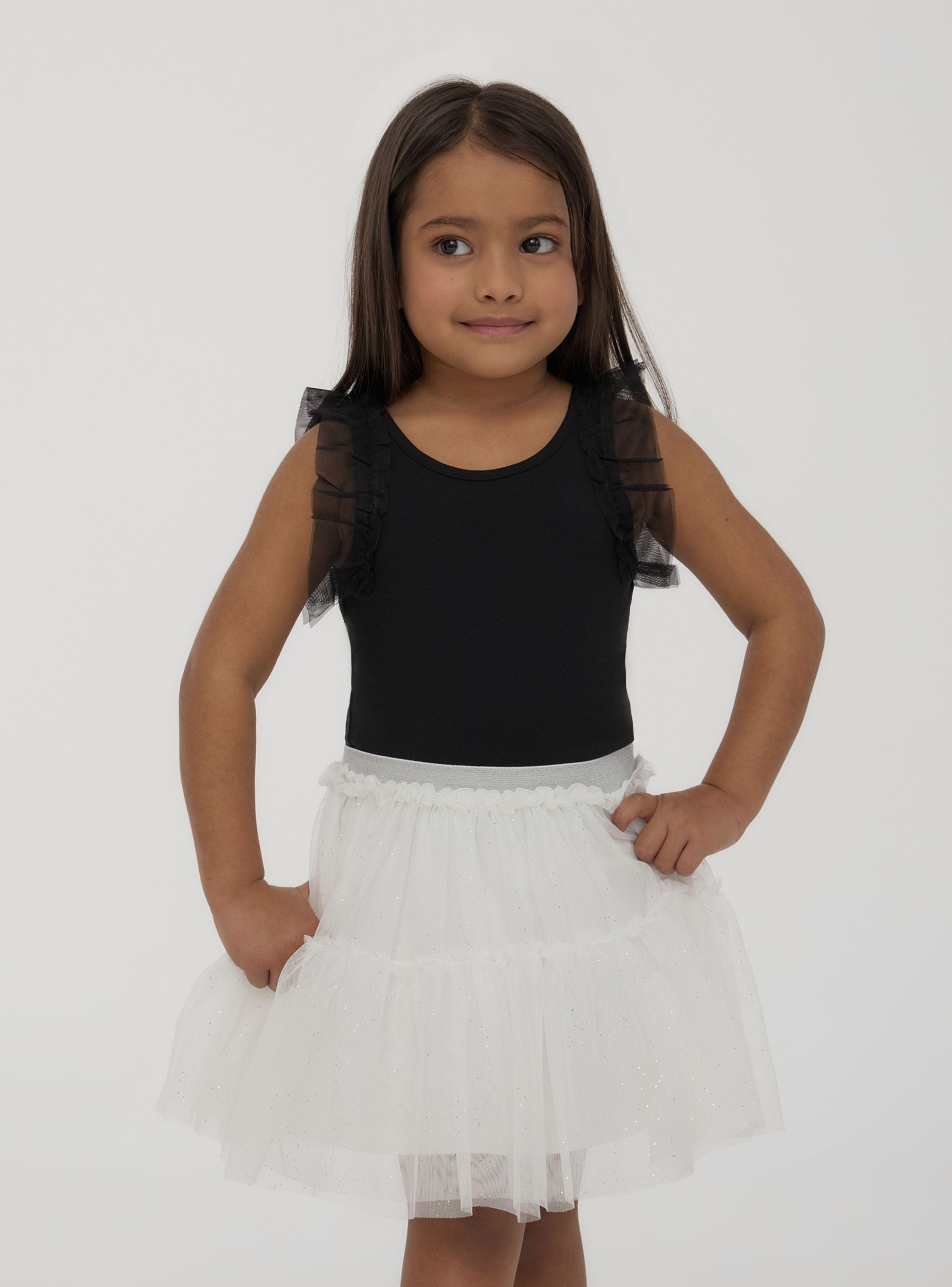 Haljina za devojčice sa bajkovitim i svetlim dizajnom, savršena za posebne prilike i razigrane stilove. Tulle daje lakoću i volumen, dok jednobojna boja obogaćena sjajnim detaljima dodaje blistav dodir. Elastična traka u struku osigurava udobno nošenje. Idealan je uz bluzu i baletanke za elegantan izgled ili uz majicu i patike za opušteniji stil.Detalji