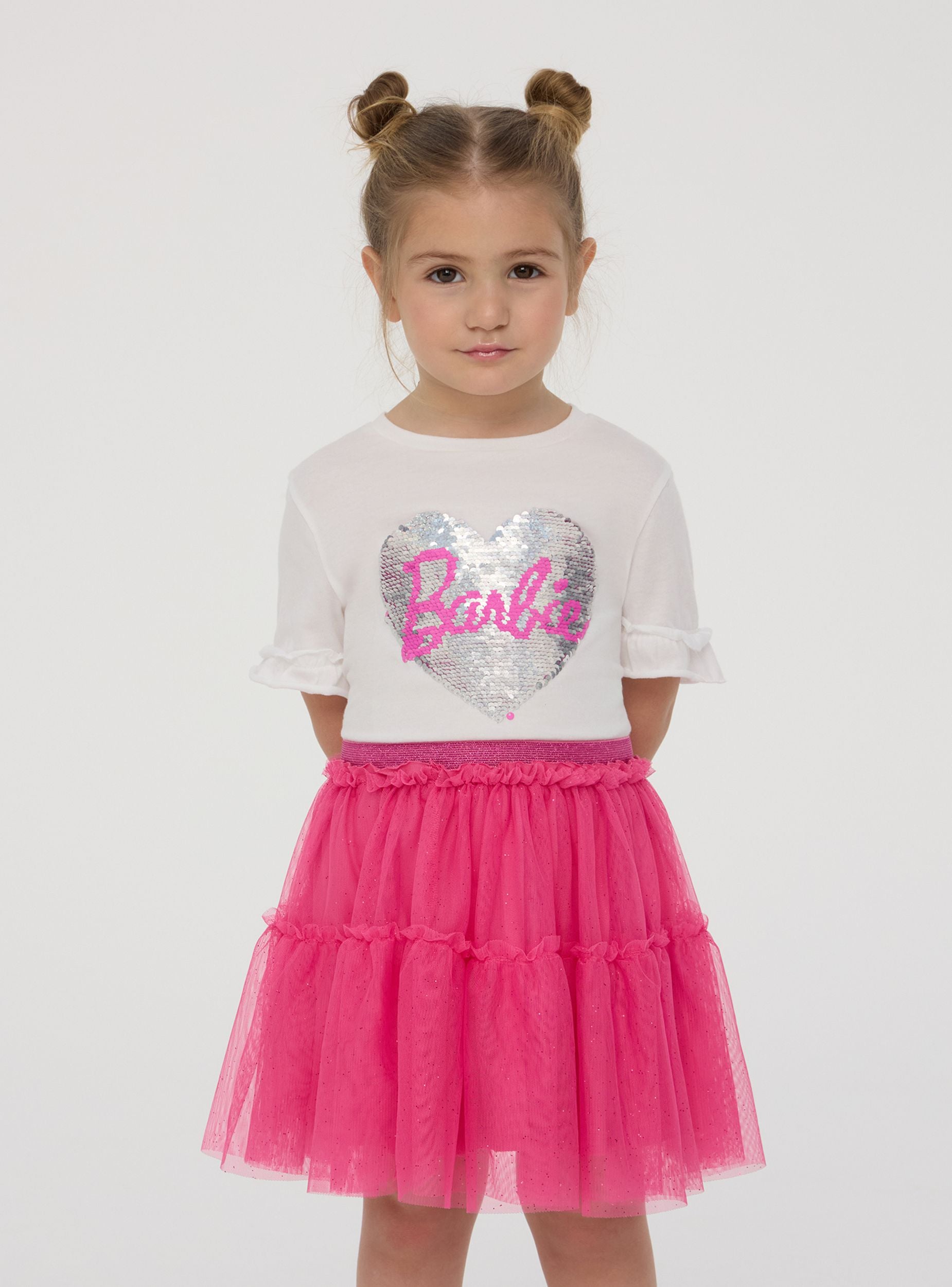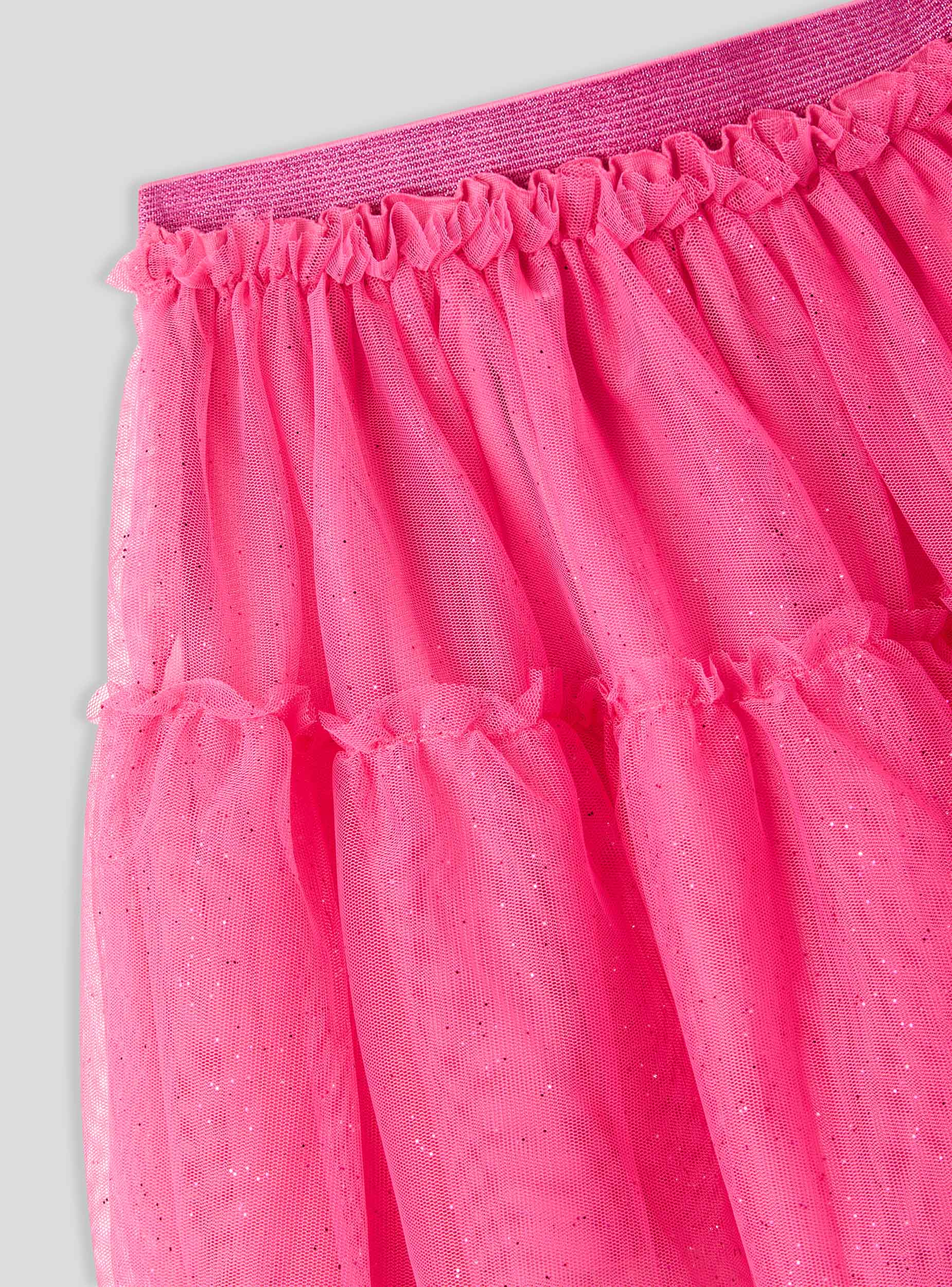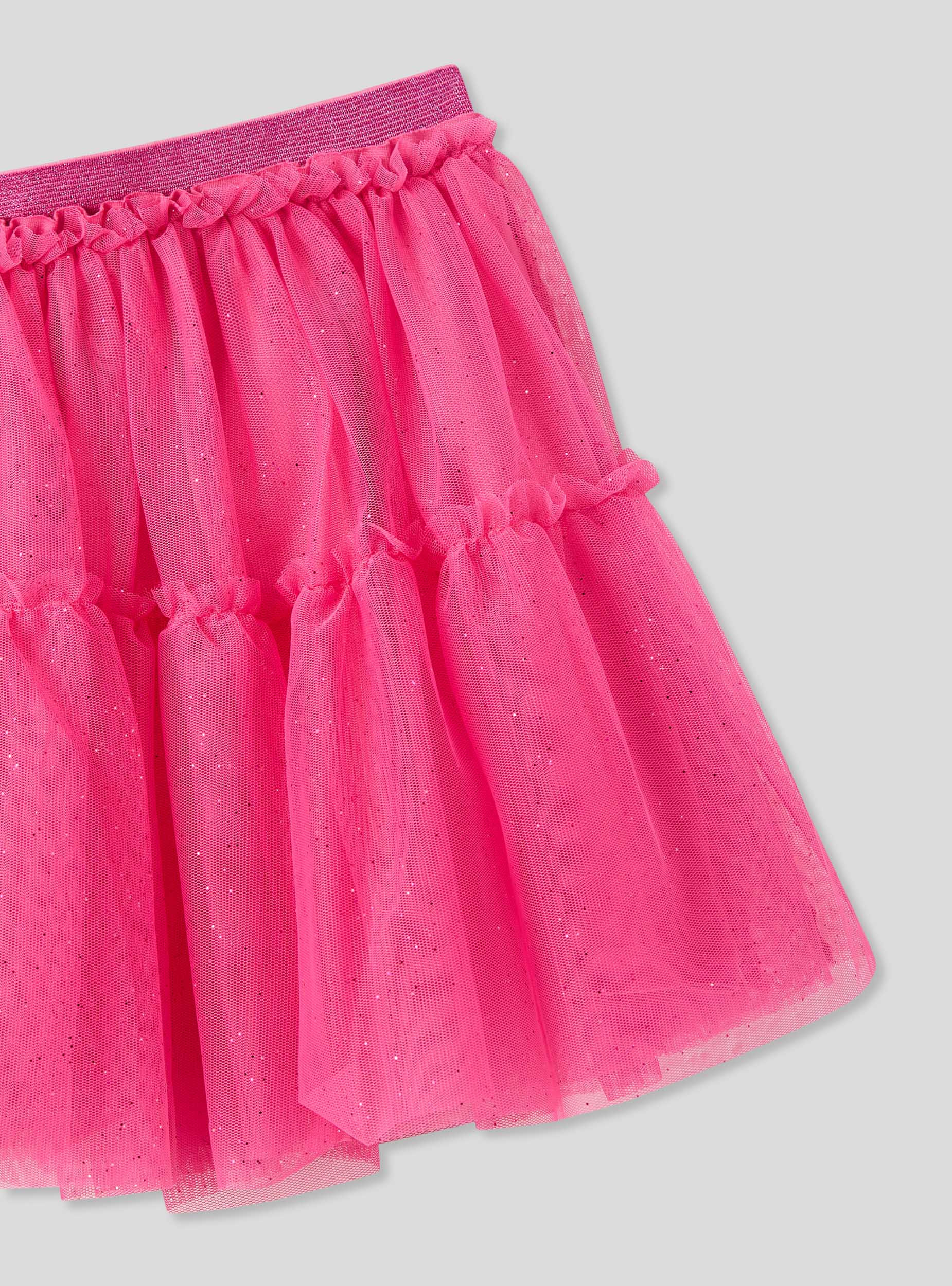 Haljina za devojčicu sa bajkovitim i svetlucavim dizajnom, savršena za posebne prilike i razigrane kombinacije. Tulle daje lakoću i volumen, dok jednobojna tkanina obogaćena detaljima od šljokica dodaje sjajan dodir. Elastična traka u struku osigurava udobno pristajanje. Idealna je uz bluzu i baletanke za elegantan izgled ili uz majicu i patike za opušteniji stil.Detalji