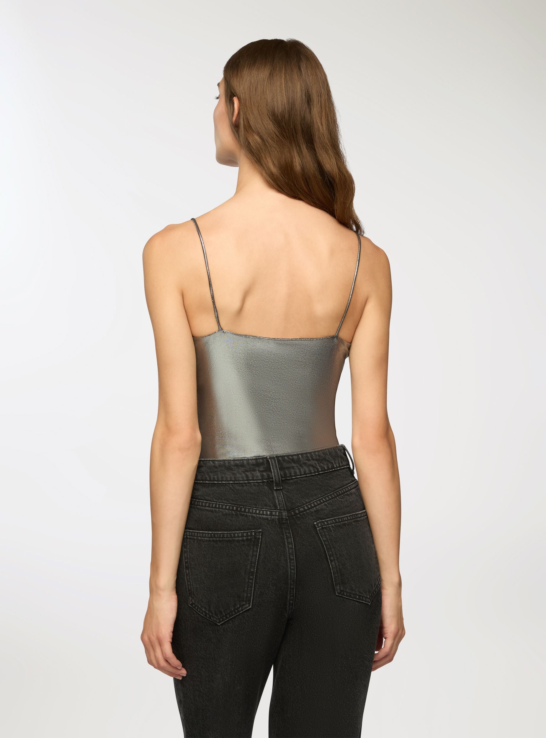 Ženski bodi sa tankim naramenicama i uskim krojem koji ističe siluetu. Tkanina ima sjajnu laminiranu završnicu, savršenu za stvaranje upečatljivih izgleda, kako za večernje izlaske, tako i za posebne prilike. Sjajni premaz dodaje glamurozan i moderan dodir, idealan za one koji vole da se ističu stilom. Može se kombinovati sa farmerkama viskog struka ili uskim suknjama.Detalji