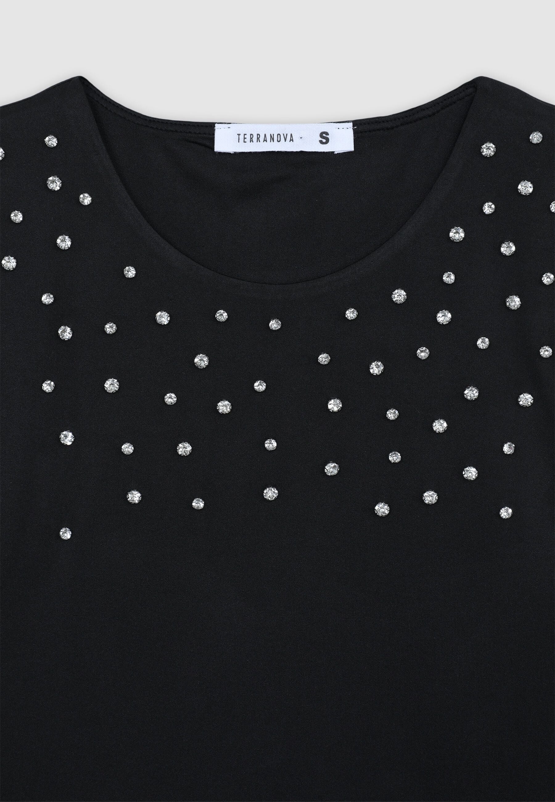 Ženski crop top sa američkim izrezom, ukrašen aplikacijama od strasa koje dodaju sjajan i rafiniran dodir. Jednobojni dizajn ga čini svestranim, savršenim za kombinovanje sa pantalonama visokog struka ili suknjama za elegantan i savremen izgled. Idealno za posebne večeri, koktele ili događaje, dodaje sjaj outfitu zadržavajući modernu i sofisticiranu privlačnost.Detalji