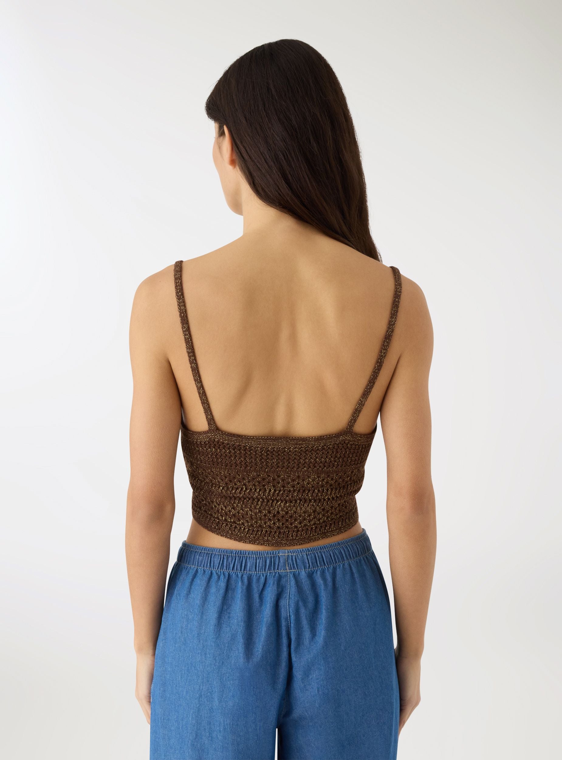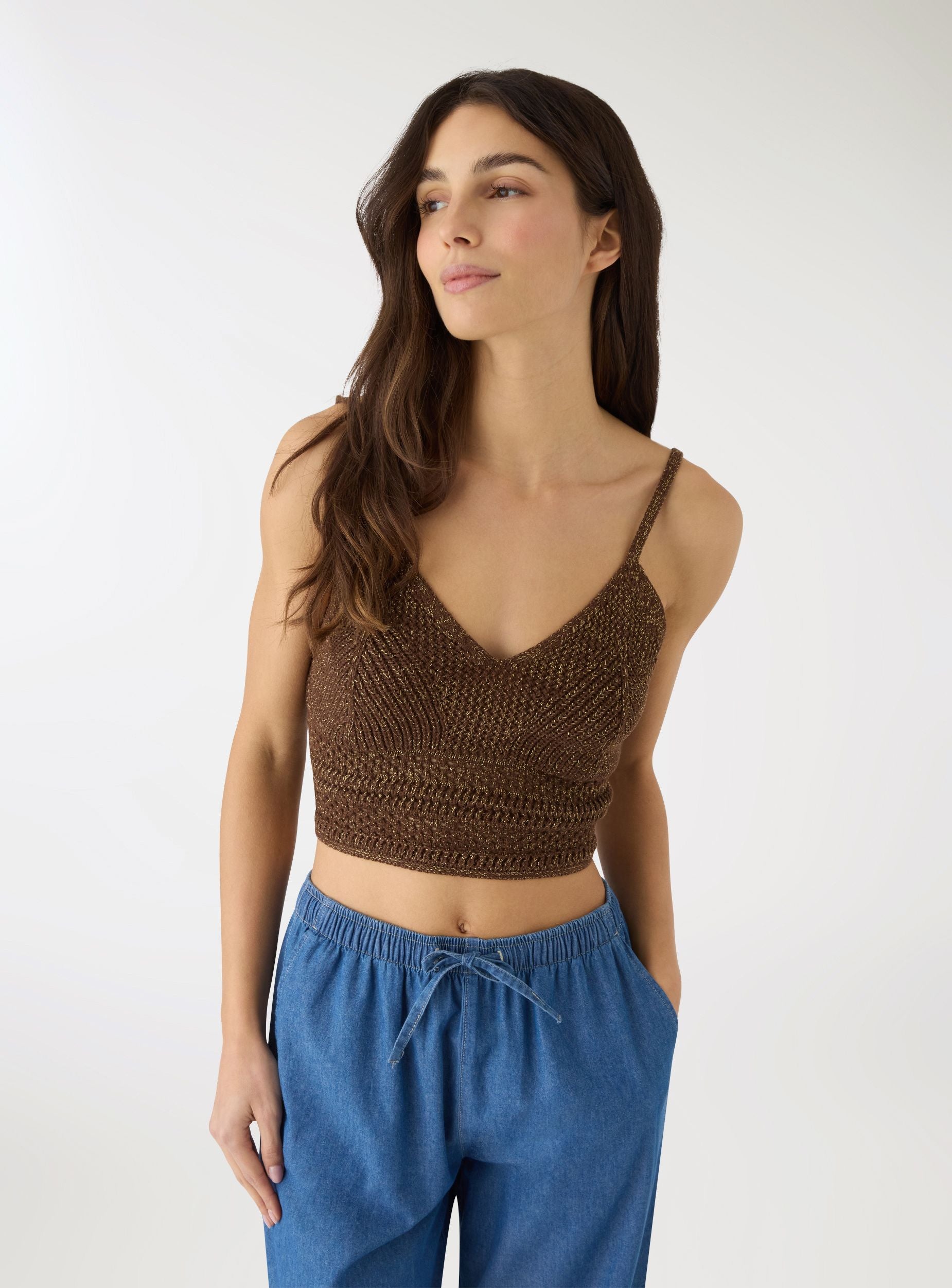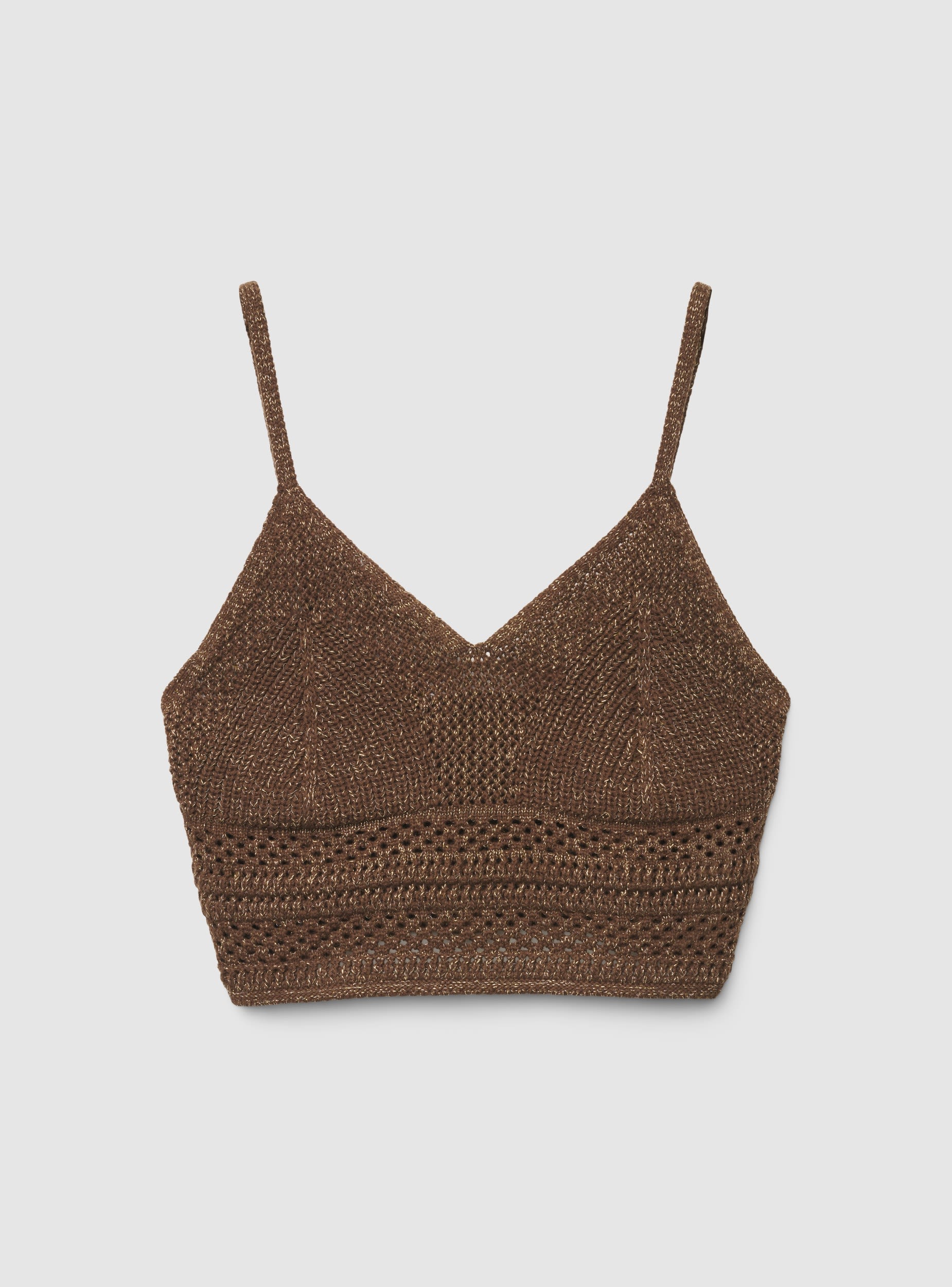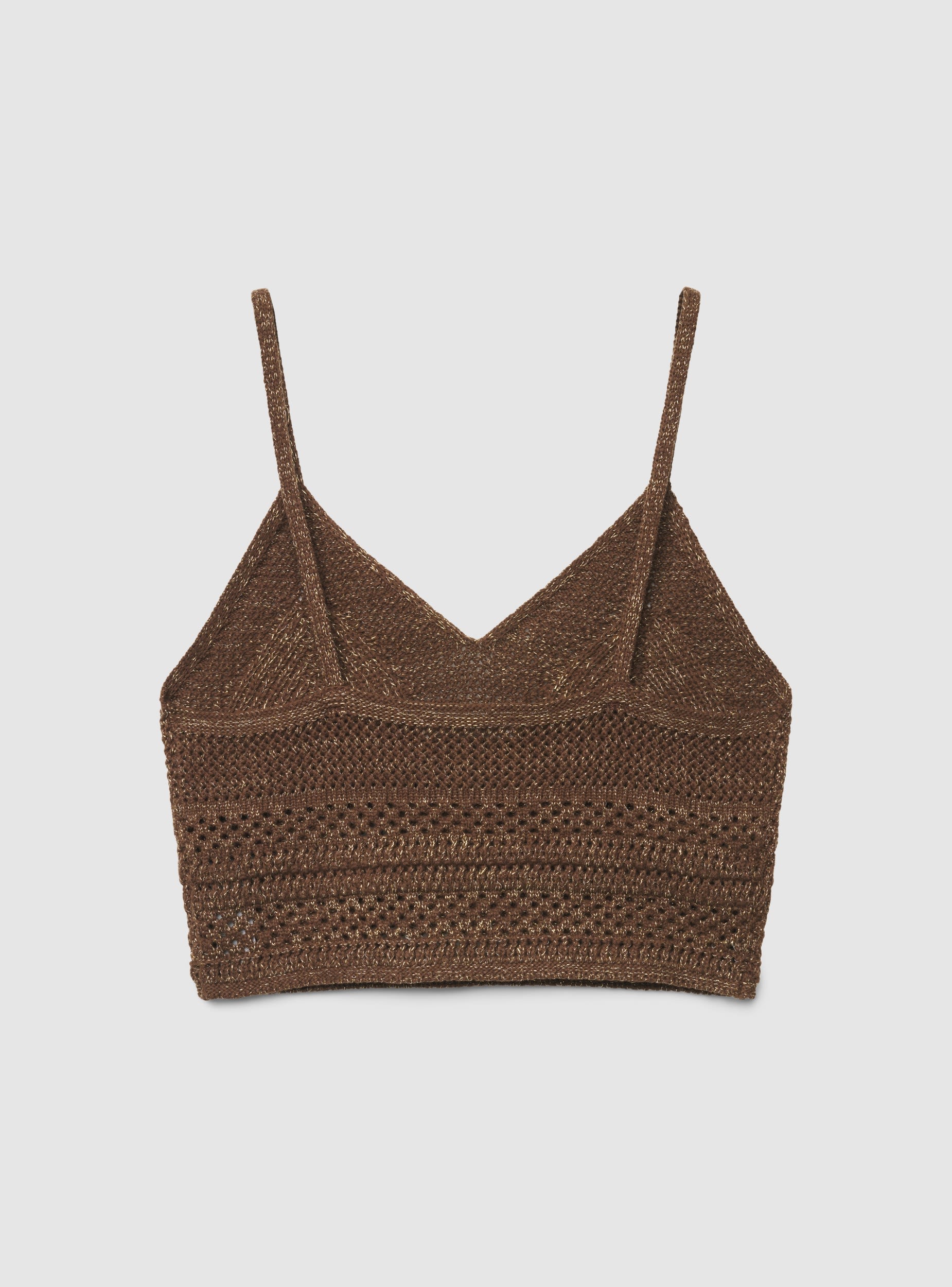 Ženski top u jednobojnoj varijanti sa tankim bretelema i V-izrezom. Hečkani rad sa providnim umetcima koji dodaju prozračnost i stil, idealan za letnje izlaske i neformalne večeri. Uže krojenje i kratka dužina savršena za farmerke sa visokim strukom, midi suknje ili šorceve. Može se nositi samostalno ili ispod laganih košulja za trendi i ženstven izgled.Detalji