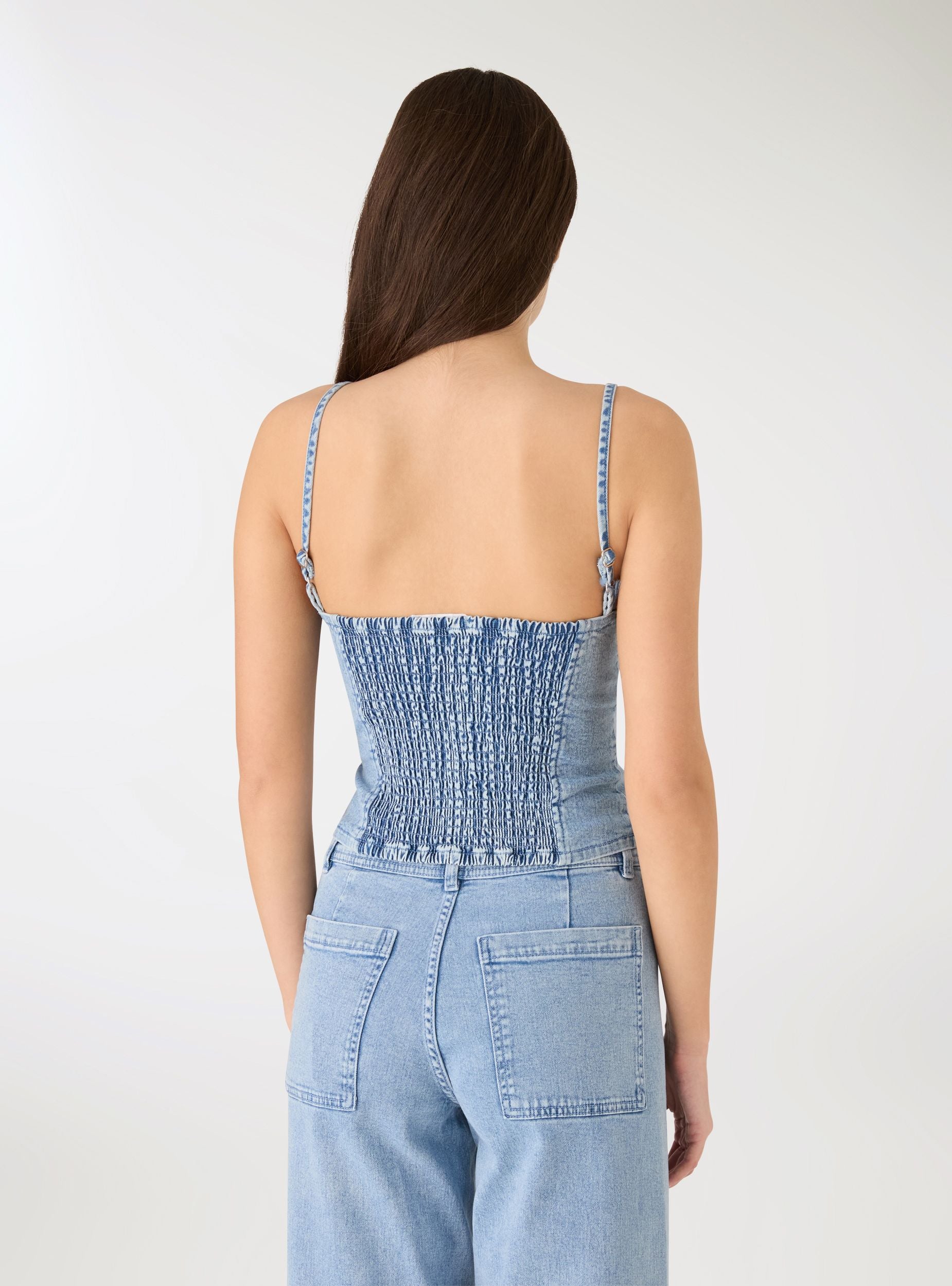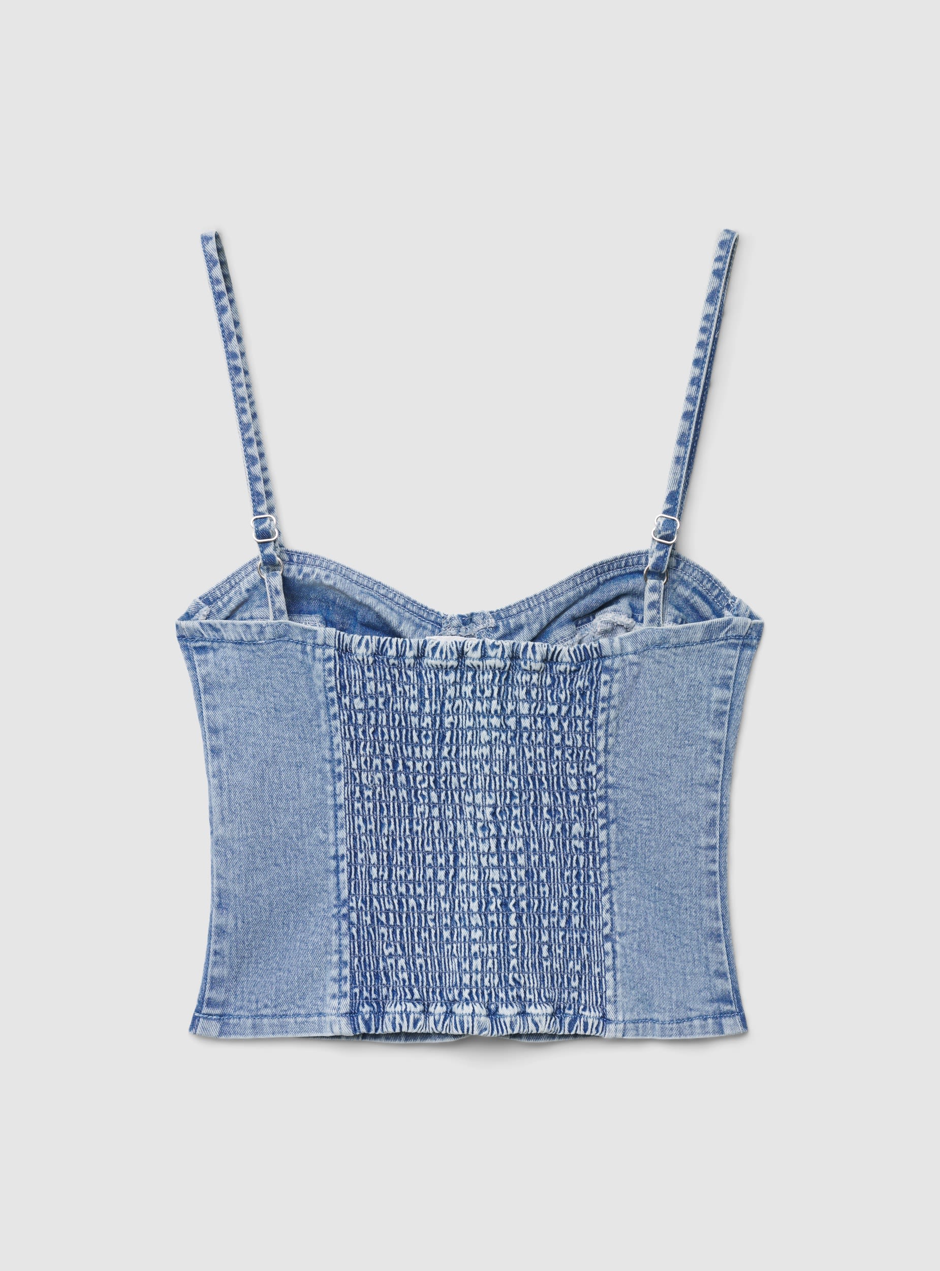 Ženski top u jednobojnom korzet stilu sa oblikovanim korpicama i vertikalnim šavovima koji vizuelno izdužuju figuru. Tanak podesiv kaiščić i elastičan zadnji deo za veću udobnost. Kratka dužina, idealna za kombinovanje sa farmericama visokog struka, midi suknjama ili šortsevima za ležerne ili večernje kombinacije. Uski kroj koji ističe linije, srcoliki izrez i konstrukcija bez vidljivih zatvarača za moderan izgled.Detalji