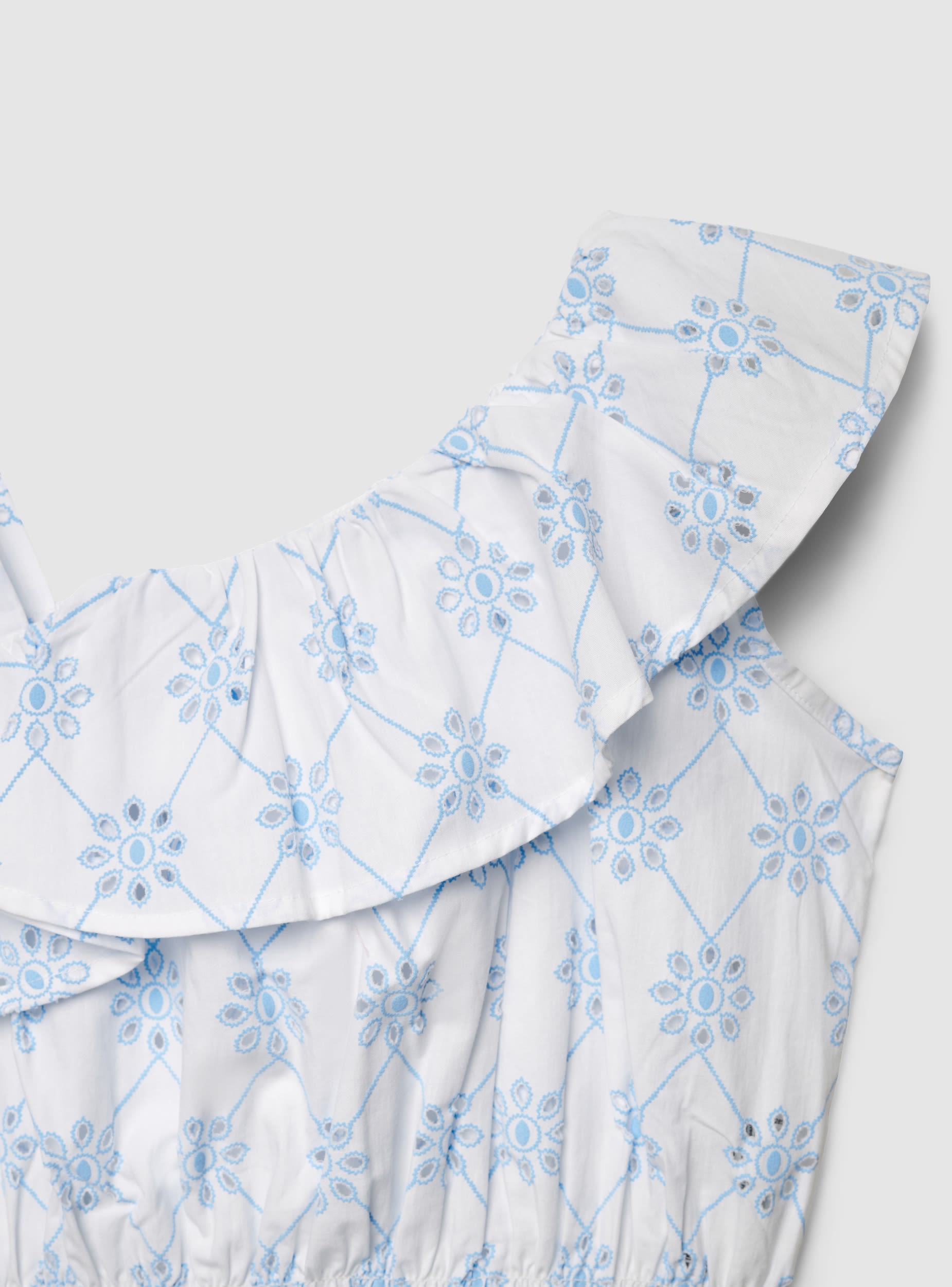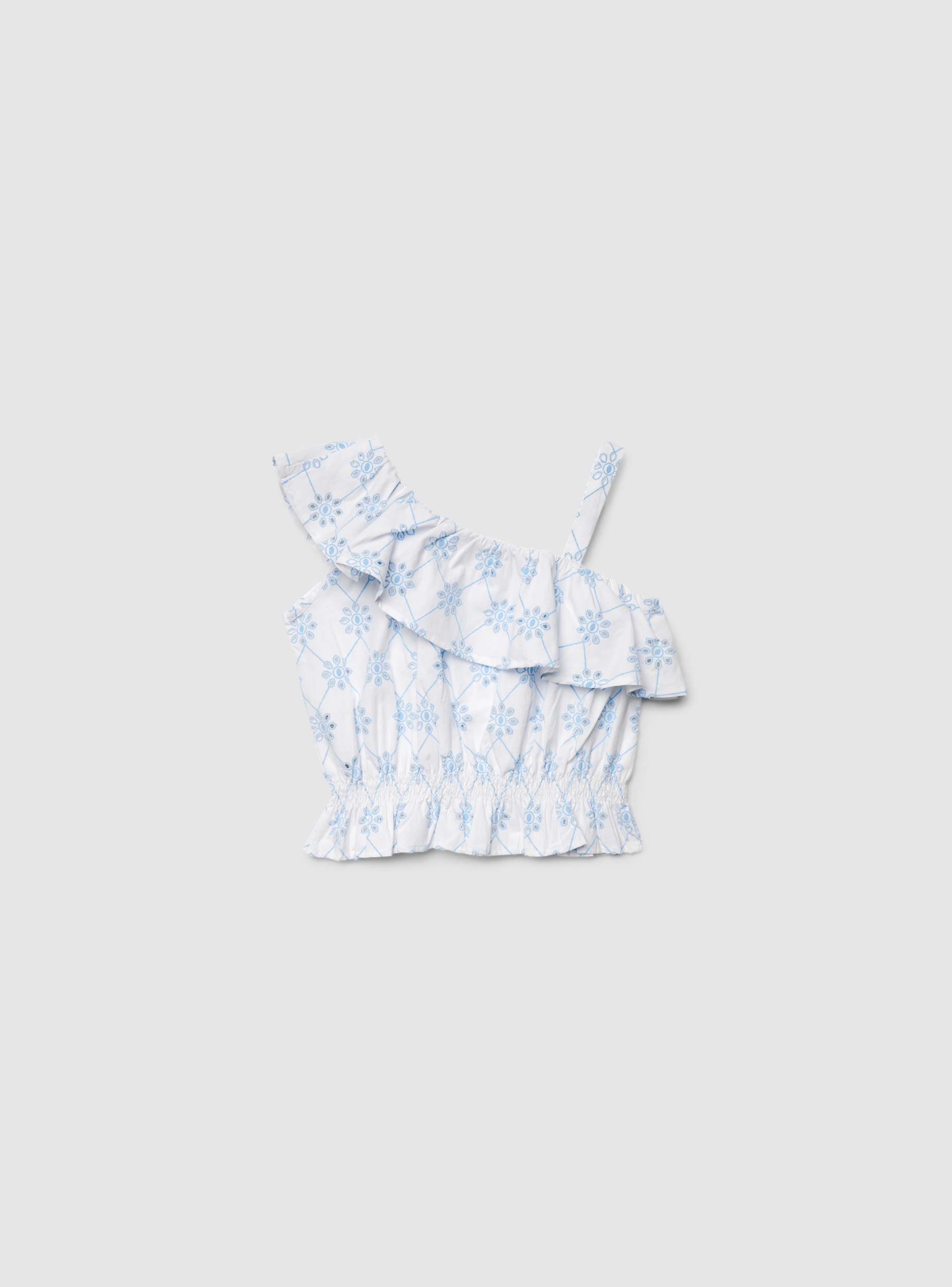 Dečiji top na jedno rame sa tankom naramenicom i širokom volanom na izrez, dizajniran za letnje izglede i posebne dane. Struk sa naboranim elastičnim pojasom definiše kroj i stvara blagi volumen na grudima. Cvjetni dezen dodaje razigrani detalj, lako se kombinuje sa farmerkama, šortsevima ili suknjama.Detalji