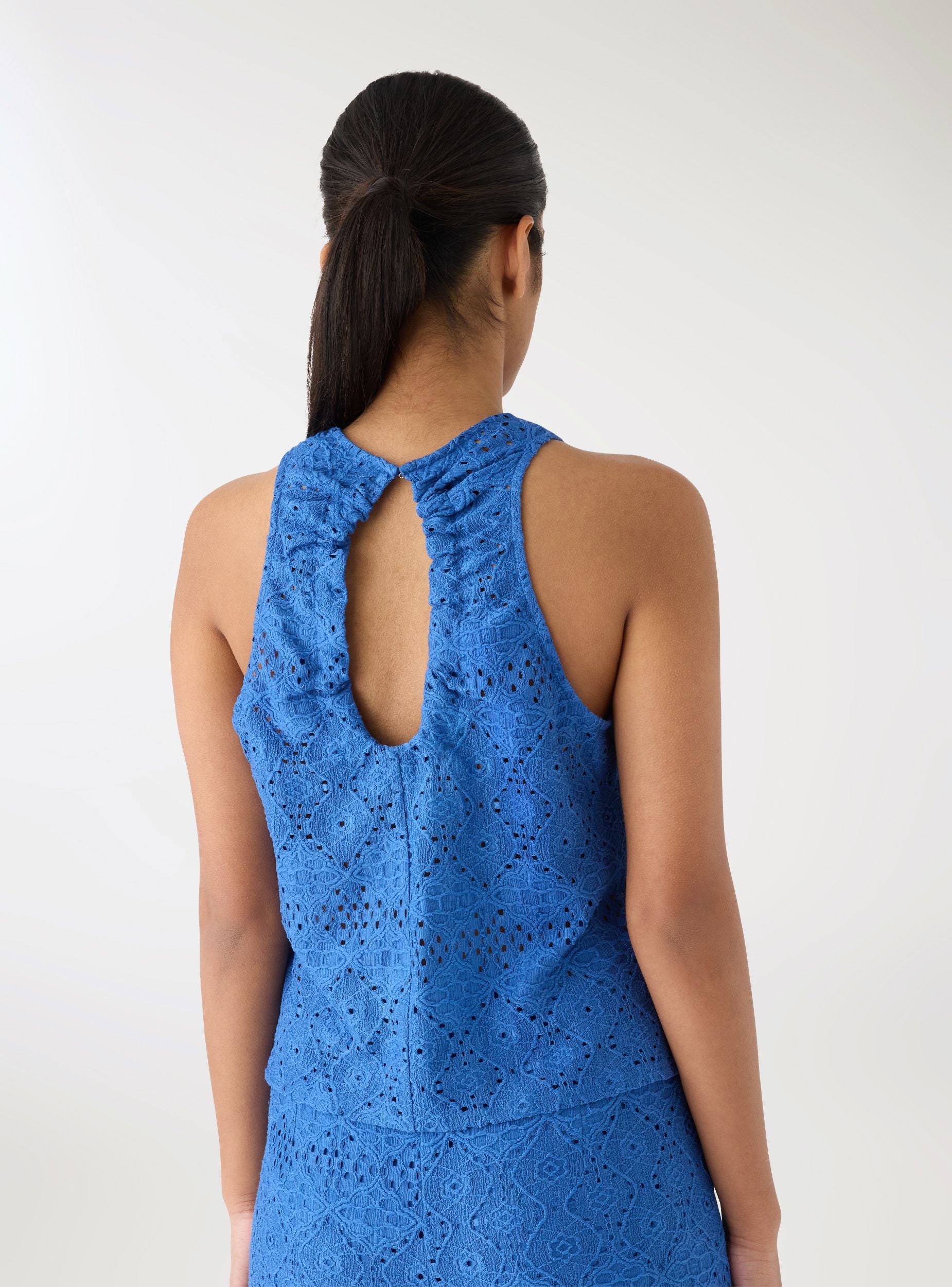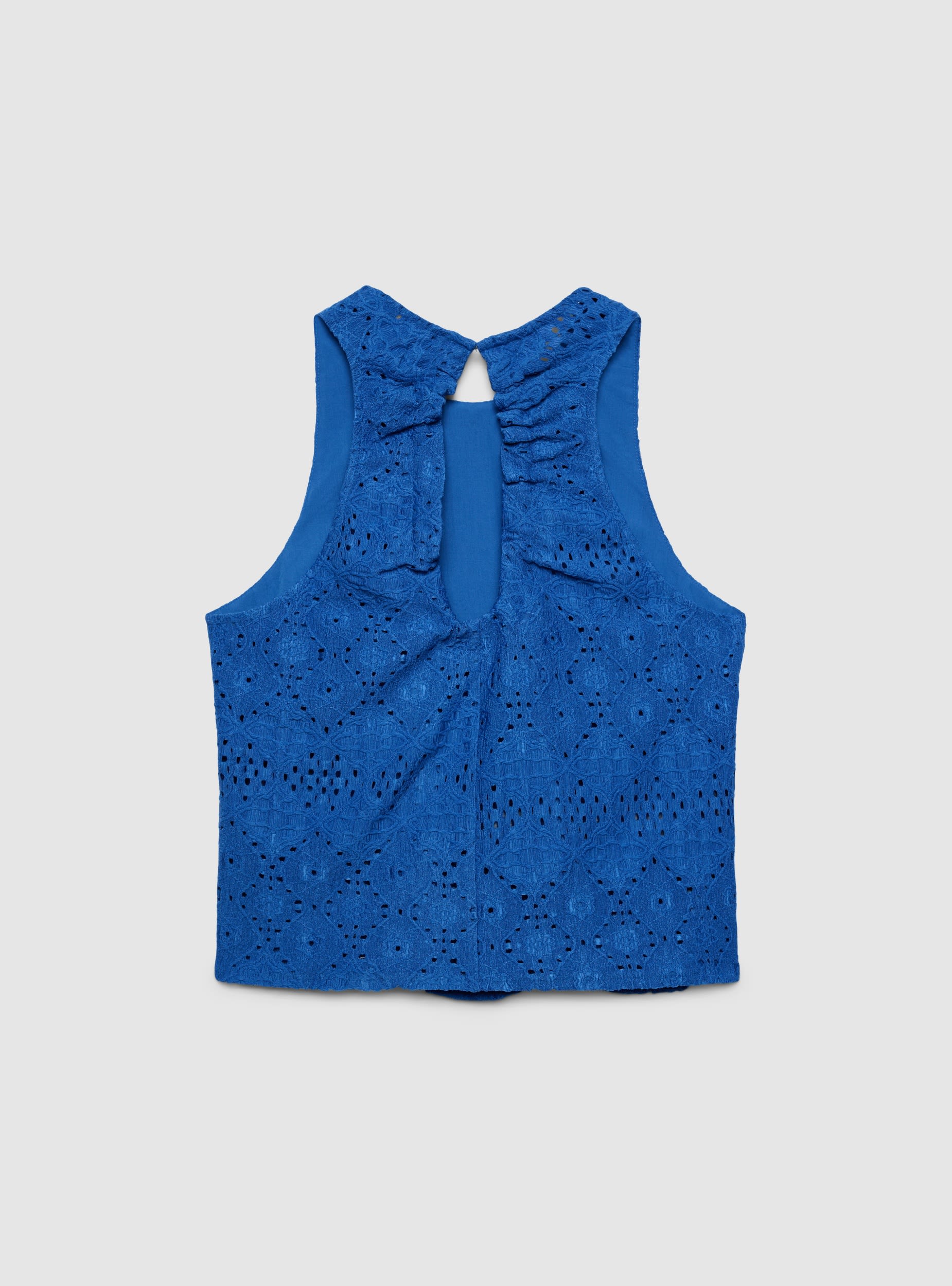 Ženski top u jednoj boji, izrađen tehnikom sangallo sa izrezbarenim motivom. Okrugli izrez i mali otvor pozadi sa kukicom za zatvaranje. Regularan kroj i standardna dužina, idealan za letnje kombinacije sa farmerkama, suknjama visokog struka ili šortsevima. Savršen za ležerne prilike ili večeri uz minimalistički nakit zahvaljujući vezu koji dodaje ženstveni dodir.Detalji