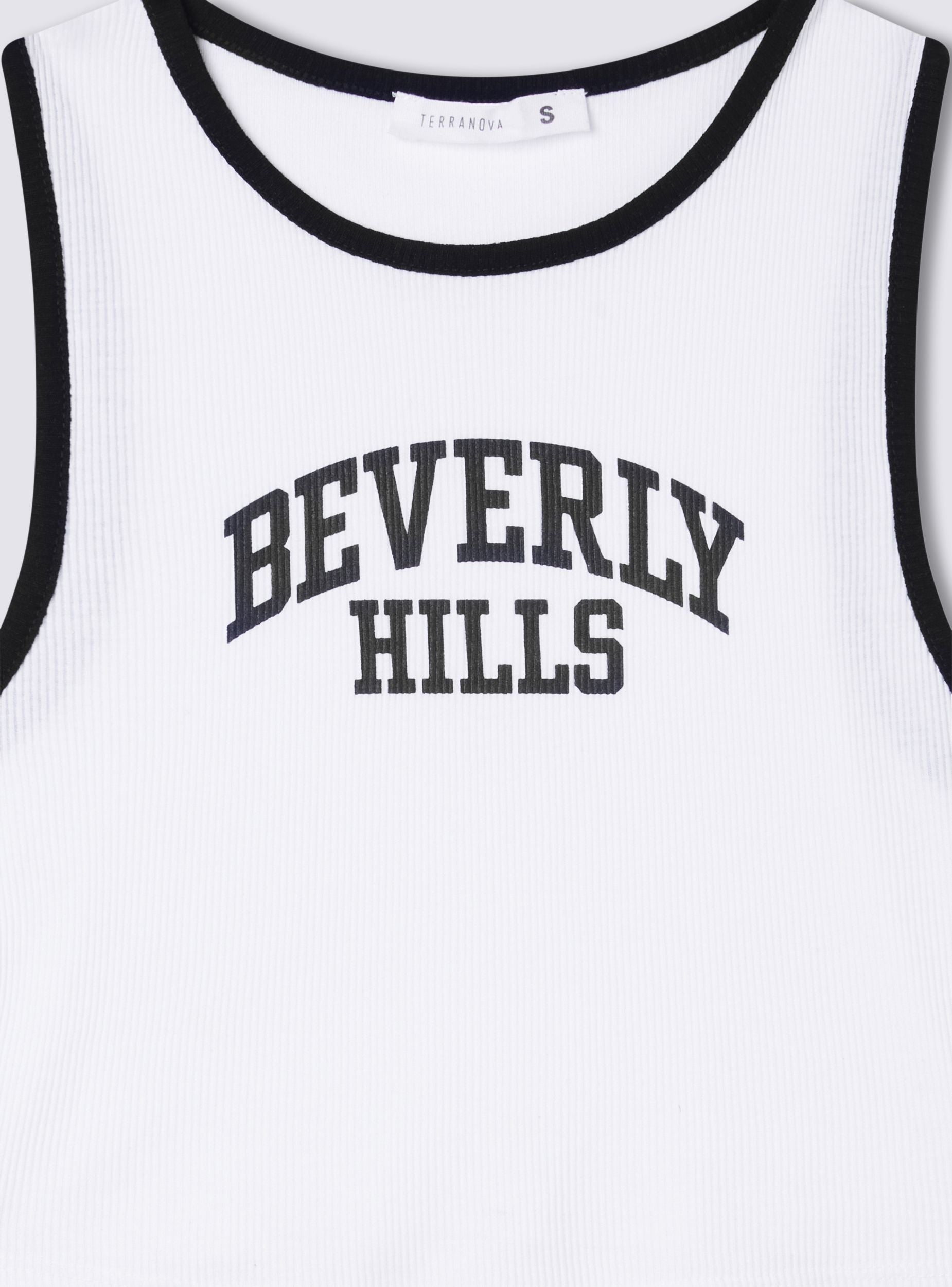 Top da donna con scollo americano e design che combina comfort e stile. I profili a contrasto aggiungono un tocco visivo distintivo, mentre la stampa con scritta in stile college sul davanti dona un look dinamico e sportivo. Perfetto per completare outfit casual, è un capo ideale per chi cerca un mix di praticità e tendenze moderne. Il modello aderente valorizza la figura, assicurando versatilità e comodità per ogni occasione informale.Detalji