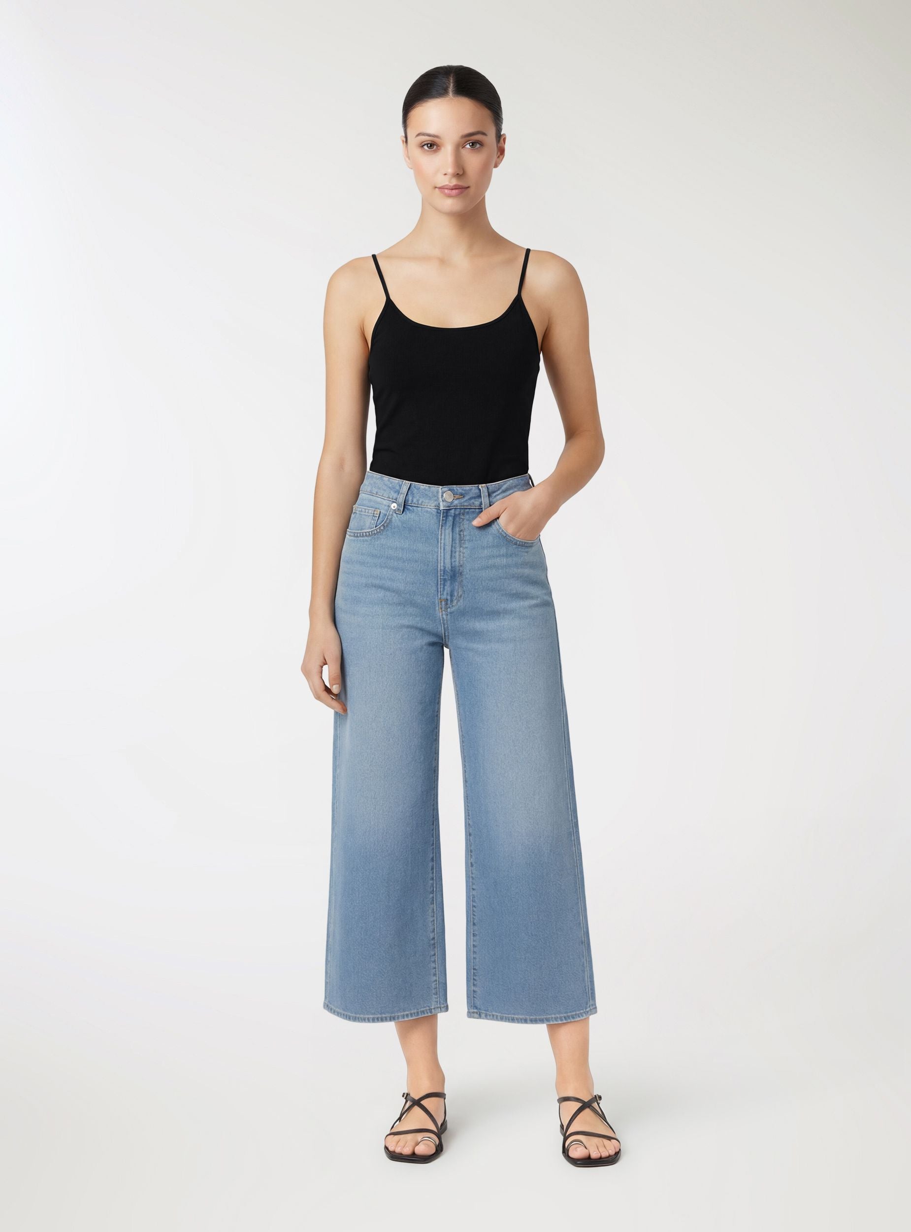 Ženska jednobojna majica bez rukava sa tankim bretelema i mekanim naboranim izrezom. Regular dužina, idealna ispod blejzera ili košulja za kancelariju, a savršena uz farmerke ili suknje za slobodno vreme. Minimalistički dizajn. Višenamenski komad koji se može nositi samostalno u toplim danima ili u slojevima tokom prelaznih godišnjih doba.