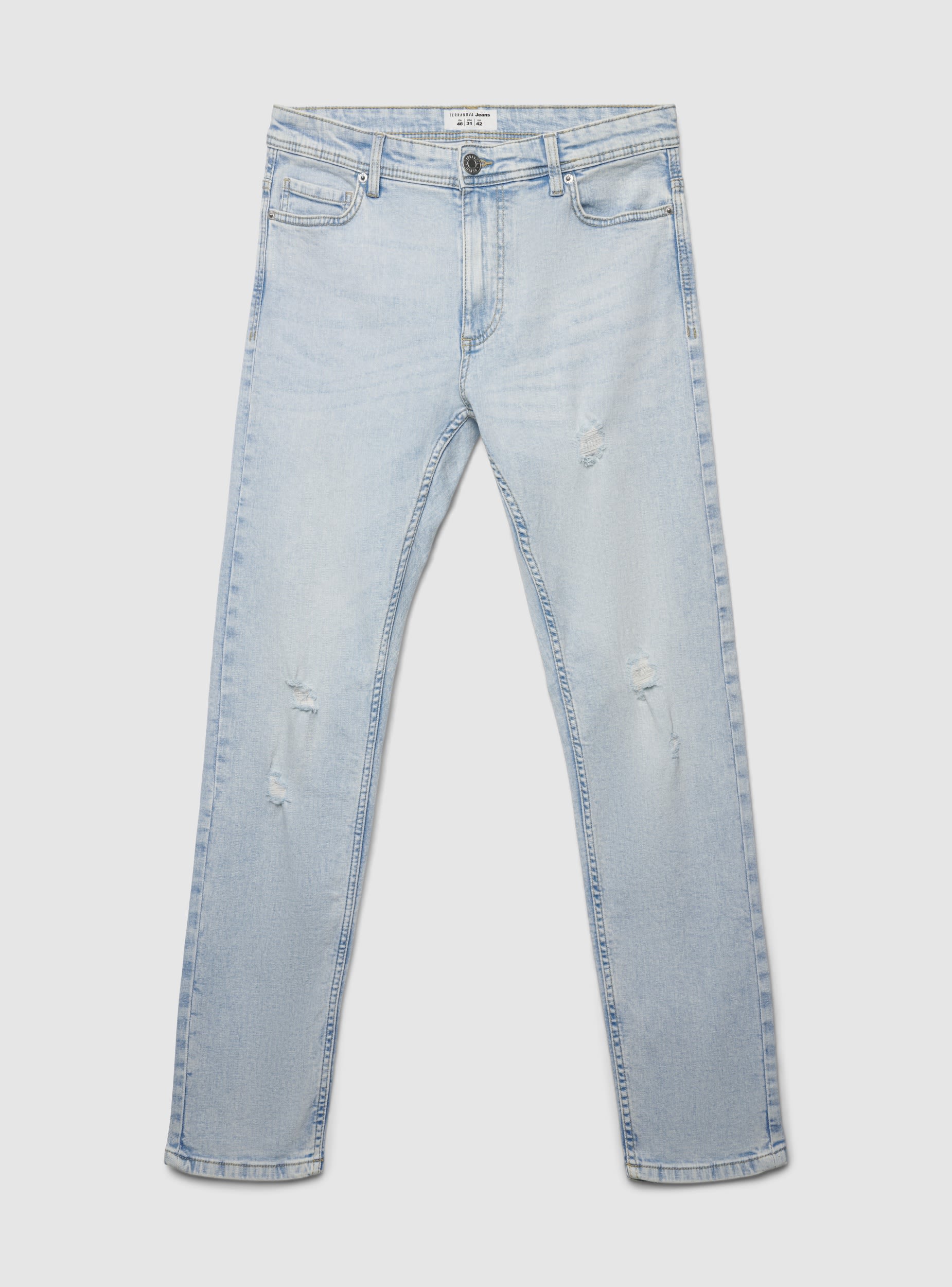 Muške farmerke sa pet džepova, kopčanjem na dugme i rajsferšlus. Skinny model, svetla pranja sa efektom habanja i poderotinama za urbani izgled. Prorezi za kaiš i kontrastni šavovi. Idealne za slobodno vreme sa majicom i patikama ili sa džemperom i laganom jaknom za sofisticirani casual outfit.Detalji