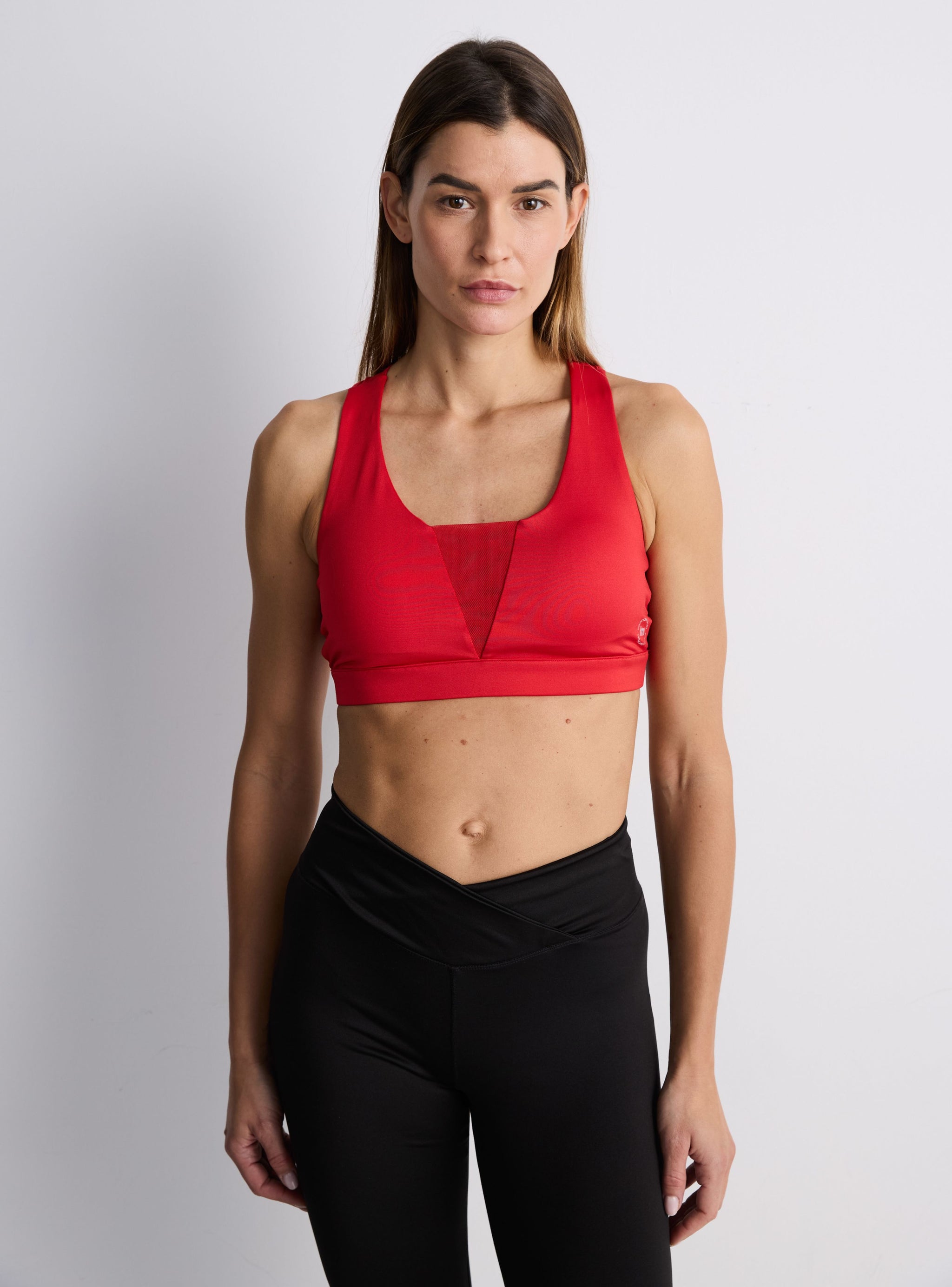 Ženski sportski top sa dizajnom veslača i mrežastim umetcima sprijeda i pozadi. Model sa korpicama i elastičnim pojasom ispod grudi pruža podršku tokom treninga i slobodnog vremena. Savršen uz helanke ili trenerke za teretanu ili dinamične aktivnosti. Jednobojni dezen sa malim bočnim logoom. Active linija.Detalji