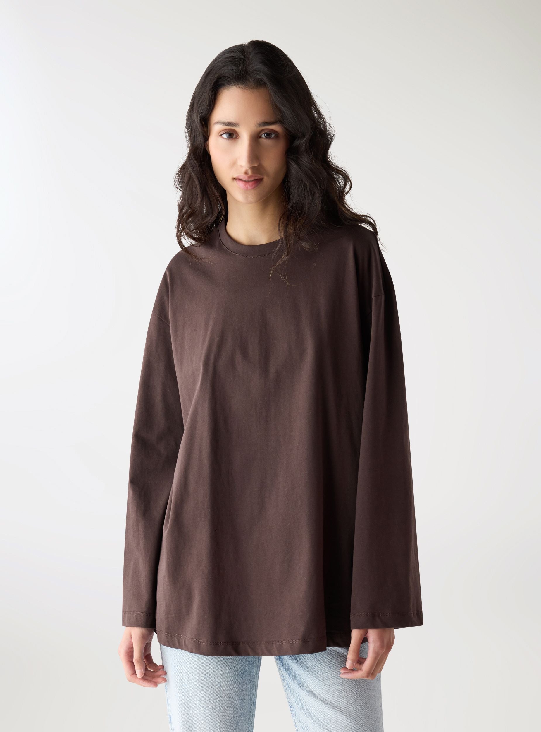 Ženska majica dugih rukava sa oversize krojem, idealna za svakodnevne i ulične stilove. Jednobojni dizajn sa okruglim izrezom lako se kombinuje sa farmerkama, suknjama ili cargo pantalonama. Pravi kroj sa blago spuštenim ramenima i urednim završecima na donjem delu i manžetnama, savršena za nošenje samostalno ili ispod jakni i blejzera tokom prelaznih godišnjih doba.Detalji